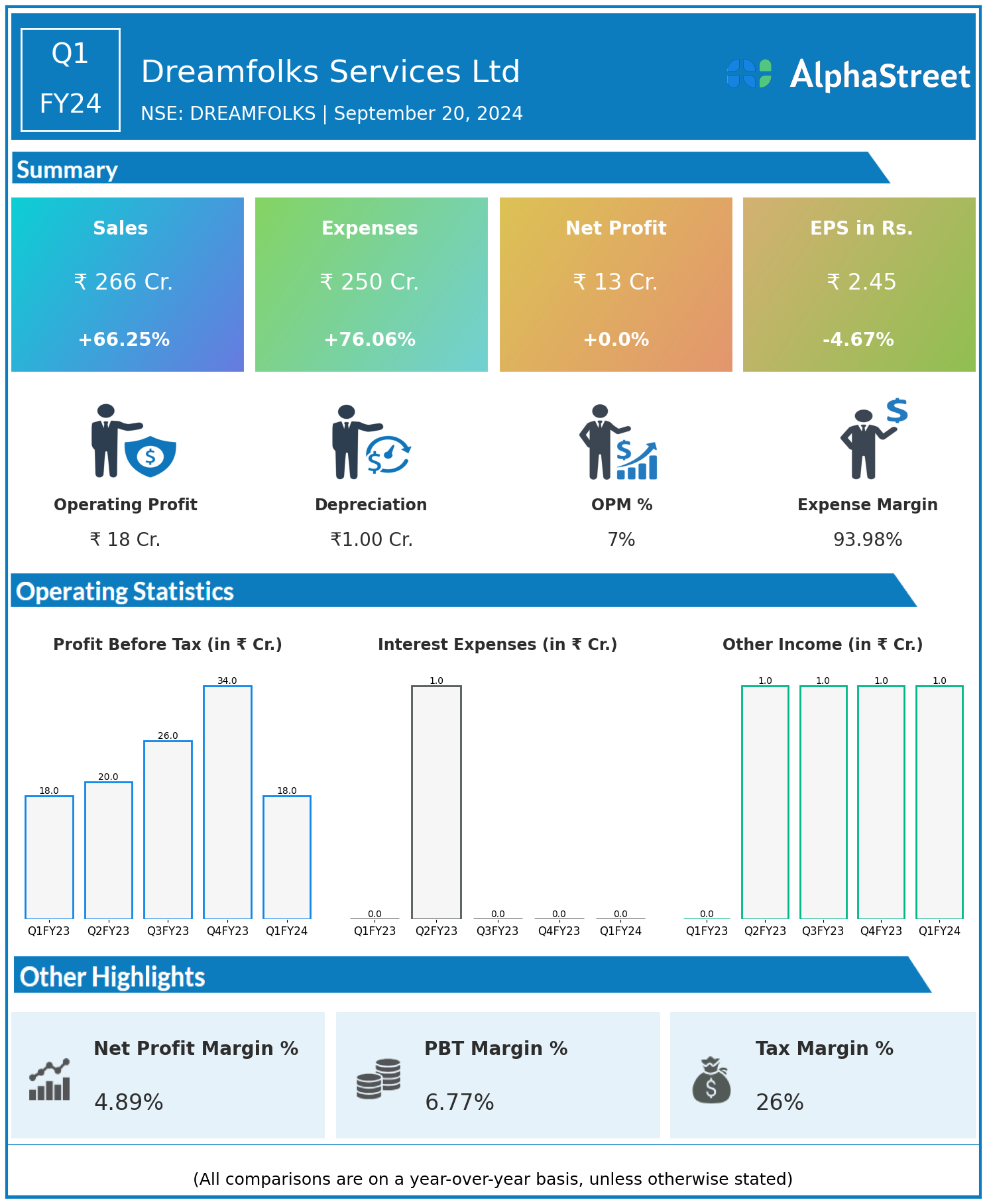 Dreamfolks Services Ltd reported Revenues for Q1FY24 of ₹266.00 Crores up from ₹160.00 Crore year on year, a rise of 66.25%.