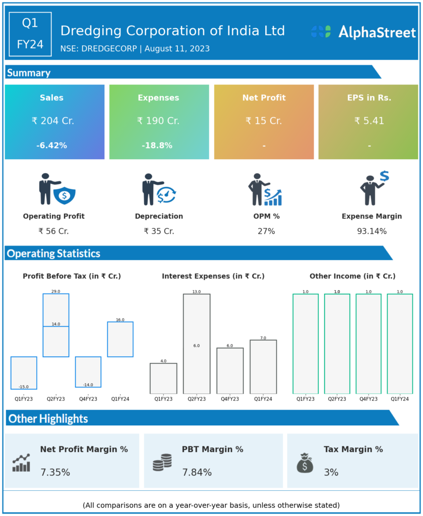 Dredging Corporation of India Ltd reported Revenues for Q1FY24 of ₹204.00 Crores down from ₹218.00 Crore year on year, a fall of 6.42%.