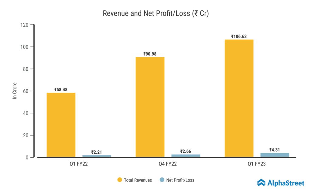 Aarvi Encon’s Revenue from Operations for Q1 FY23 was ₹106.63 Crore, an increase of 82.3% from the same quarter previous year. The Total expenses for this quarter were ₹102.61 crore, an increase of 81.8% from Q1 FY22. Meanwhile, the Profit Before Tax improved to ₹4.35 Crore from ₹2.21 Crore from the same quarter previous year. The Consolidated Net Profit was ₹4.31 crore, up 95% from ₹2.21 crore year on year. This quarter’s earnings per share was ₹2.92.