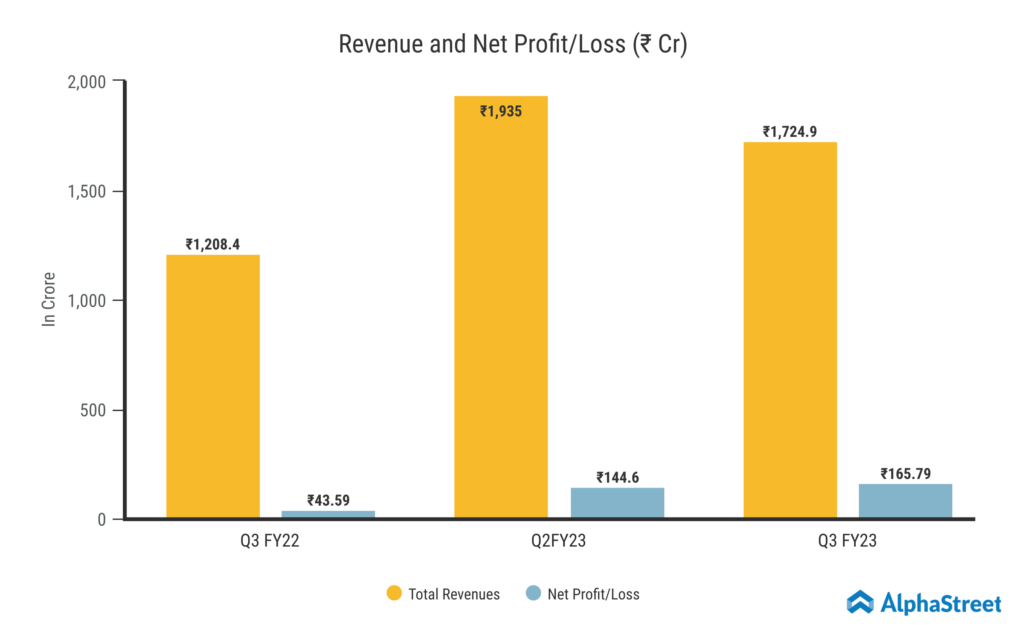 Fertilizers and Chemicals Travancore (NSE: FACT) is a public sector fertilizer manufacturing company in India, engaged in the production and distribution of various fertilizers and chemicals. The company has a diverse product portfolio that includes urea, ammonia, ammonium sulphate, sulphuric acid, and caprolactam. In terms of earnings, Revenue from Operations for Q3 FY23 was ₹1,721.94 crore, a 42% increase from ₹1208.4 crore in the same period last year. The Fertilizer segment, generated a total of ₹1,534.75 Crore in revenue, or 89% of the Total Revenue. The Petrochemical segment jumped by 33% from the previous year up to ₹198.5 Crore. The Consolidated Net Profit was ₹165.79 crore, up 283% from ₹43.59 crore in the same quarter last year. This quarter’s earnings per share was ₹2.56.