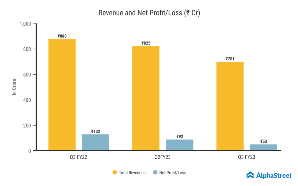 Revenue from Operations for Q3 FY23 was ₹701 crore, a 20% decrease from ₹880 crore in the same period last year. The Graphite & Carbon segment generated a total of ₹650 Crore in revenue, or 93% of the Total Income. The Graphite & Carbon segment fell by 21% from the previous year down from ₹824 Crore. The Others segment accounts for remaining percent of revenue in Q3 FY23. A total of ₹51 Crore were contributed by the segment, a sharp decline of 9% from the same quarter last year. The Consolidated Net Profit was ₹53 crore, down 60% from ₹132 crore in the same quarter last year. This quarter’s earnings per share was ₹2.66.