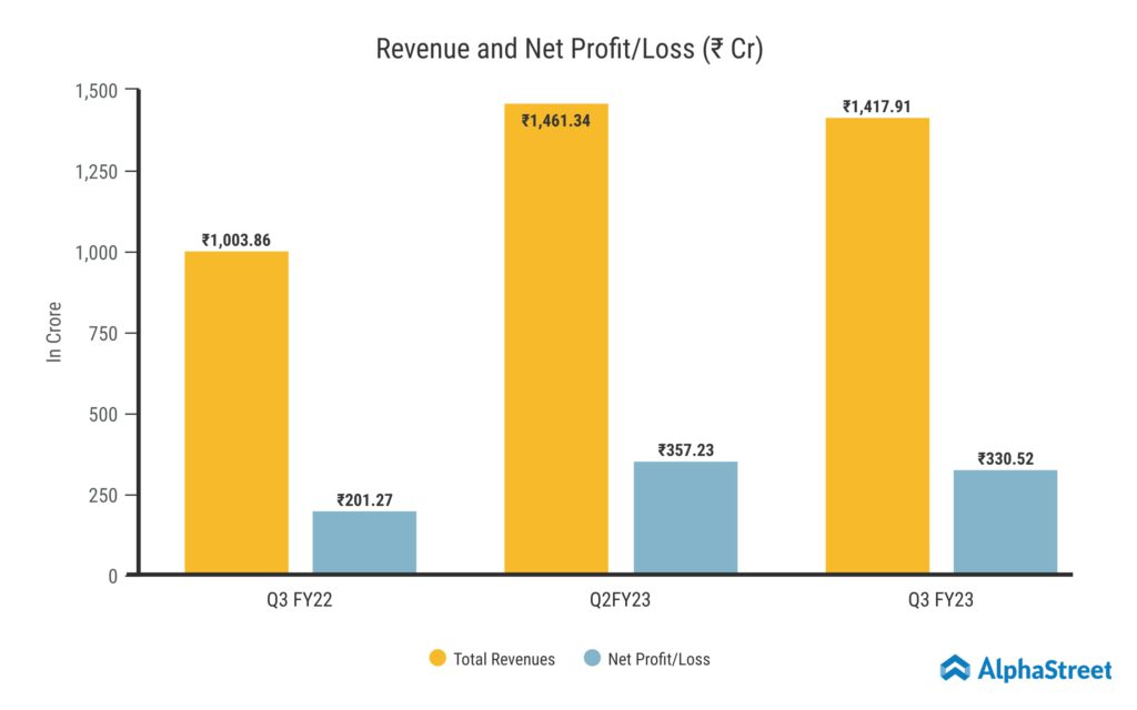 In terms of earnings, Revenue from Operations for Q3 FY23 was ₹1,417.91 crore, a 41% increase from ₹1,003.86 crore in the same period last year. The Other Income for this quarter is ₹21.41 Crore down from ₹32.02 crore year on year. The Consolidated Net Profit of ₹330.52 Crore, up 64% from ₹201.27 Crore in the same quarter of the previous year. The Earnings per Share is ₹30.09for this quarter.