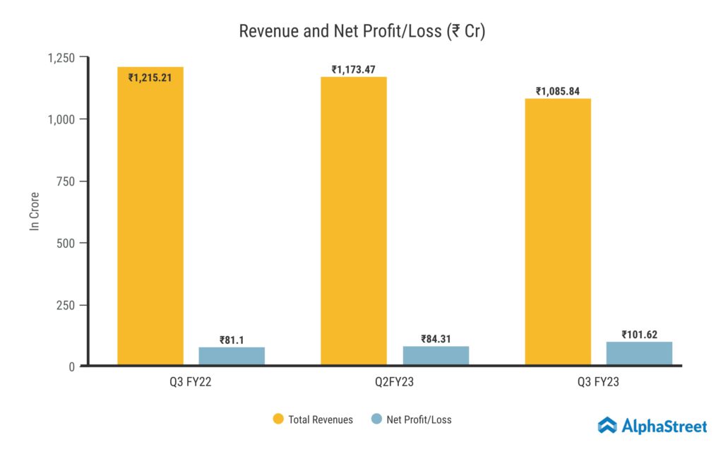 In terms of earnings, Revenue from Operations for Q3 FY23 was ₹1,085.84 crore, a 11% decrease from ₹1,215.21 crore in the same period last year. The EBIDTA margin increased from 14.36% in Q3FY22 to 17.80% in Q3FY23. PAT, which was 102 crores in Q3FY23, increased by 25.30% YoY and 20.53% QoQ. PAT margin rose from 7.18% in Q2FY23 to 9.36% in Q3FY23. In Q3FY23, revenue from the Products segment increased to 64% from Q3FY22’s 42%. Strong order book worth more than ₹7000 crores.