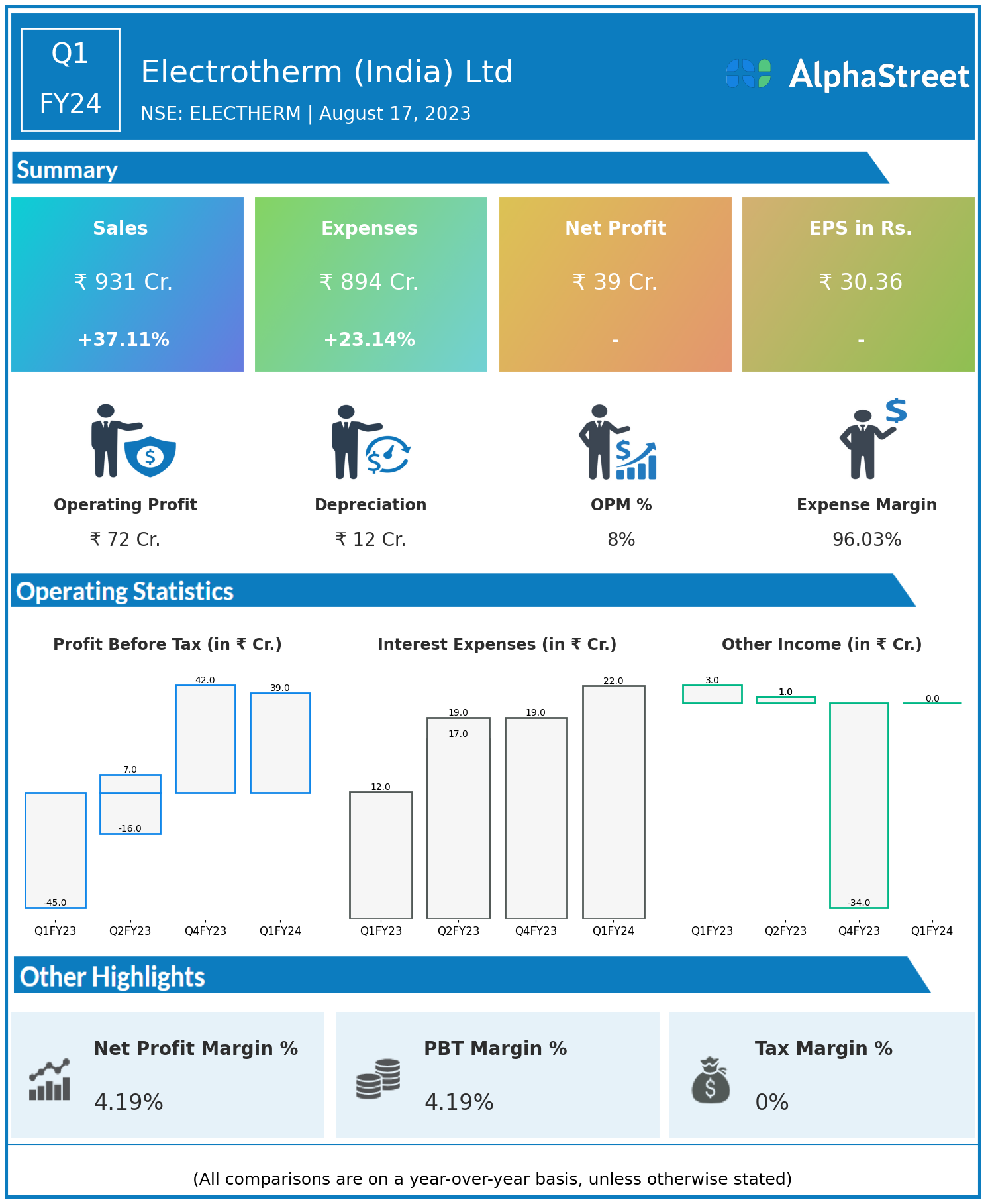 Electrotherm (India) Ltd reported Revenues for Q1FY24 of ₹931.00 Crores up from ₹679.00 Crore year on year, a rise of 37.11%.