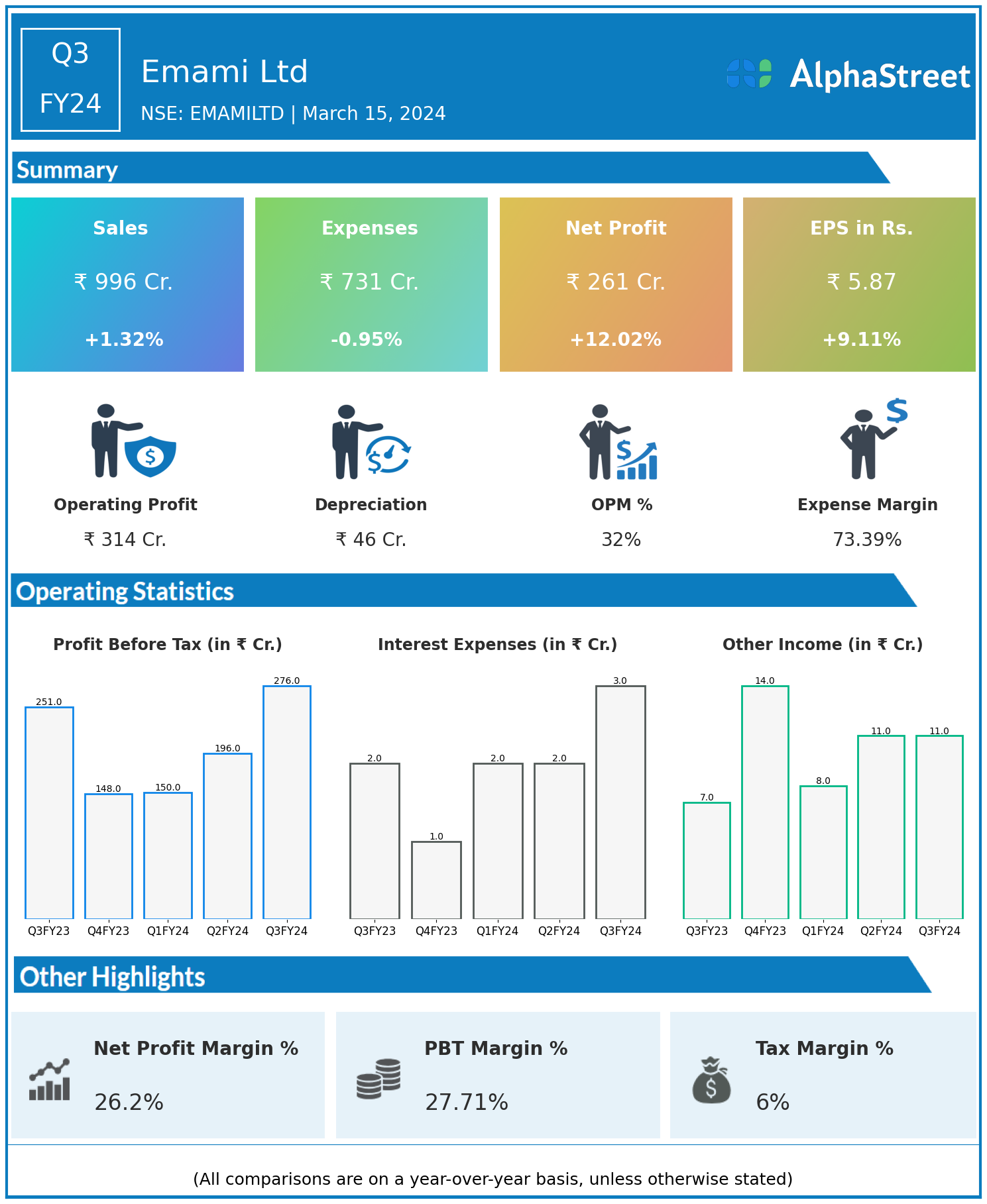 Emami Ltd reported Revenues for Q3FY24 of ₹996.00 Crores up from ₹983.00 Crore year on year, a rise of 1.32%.