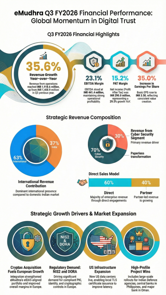 eMudhra Limited (BSE: 543533, NSE: EMUDHRA) announced its unaudited consolidated financial results for the quarter ended December 31, 2025. The company reported revenue from operations of INR 1,910.6 million, representing a 35.6% year-over-year increase compared to Q3 FY25. Net income (PAT) for the quarter reached INR 290.0 million, a 29.5% increase over the same period last year. This growth was primarily driven by a diversified revenue base and increased product-led revenue in international markets.