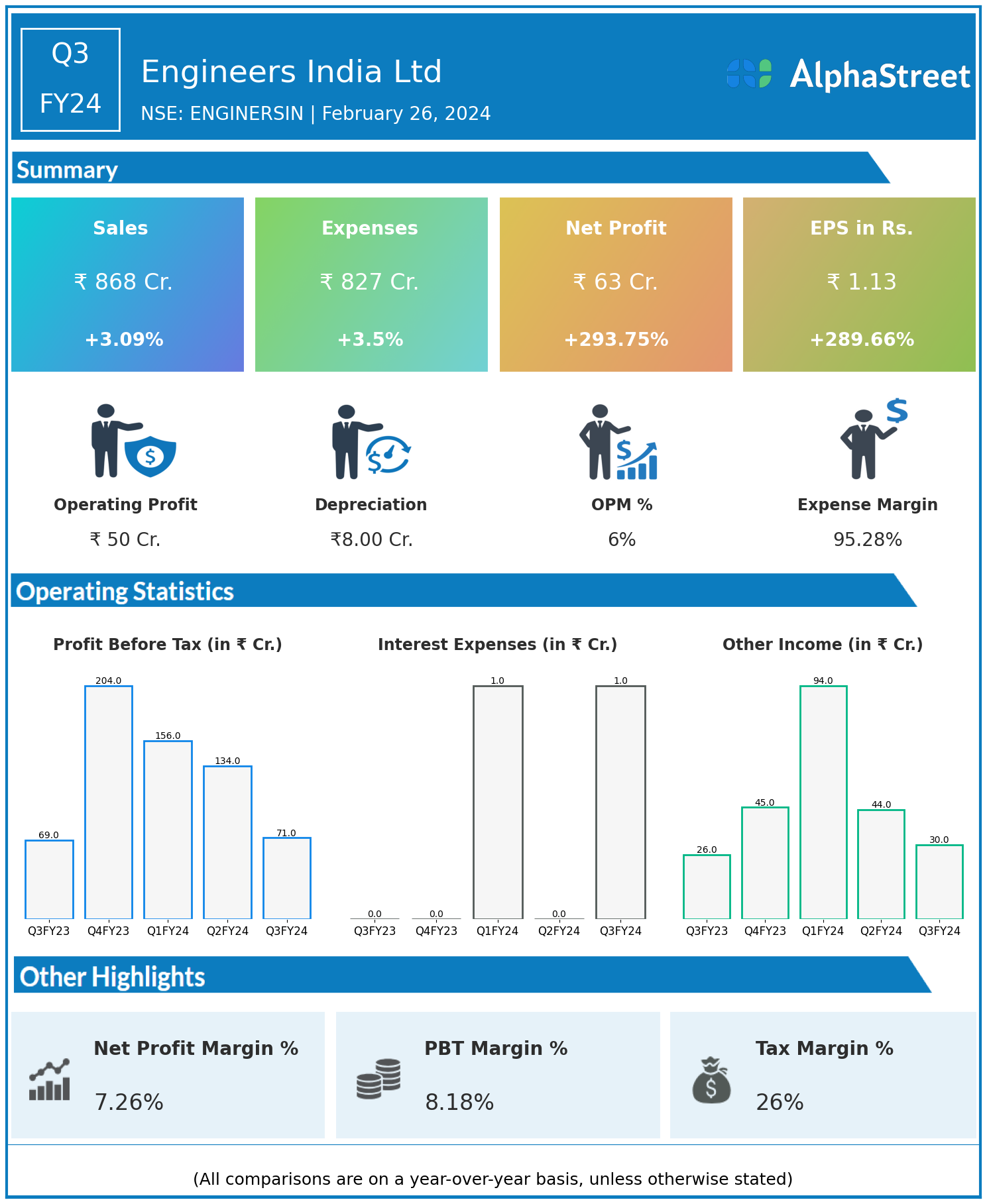 Engineers India Ltd reported Revenues for Q3FY24 of ₹868.00 Crores up from ₹842.00 Crore year on year, a rise of 3.09%.
