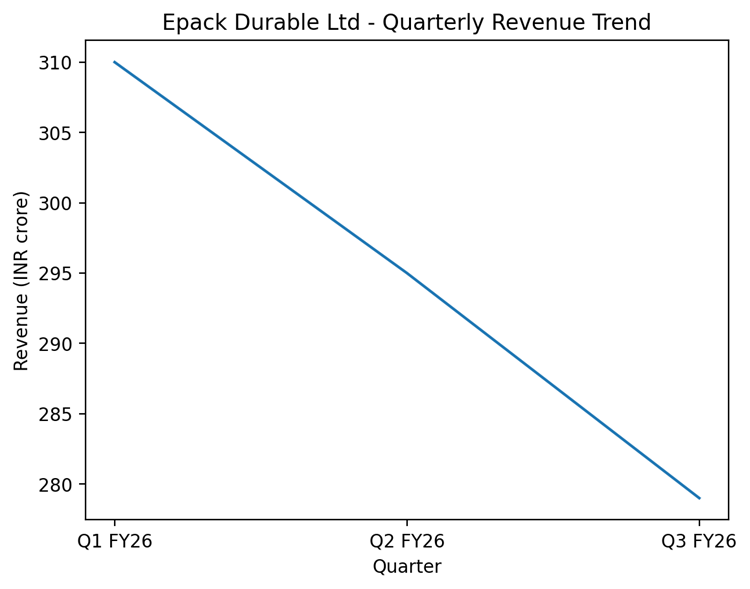 For the quarter ended December 31, 2025, Epack Durable reported consolidated revenue of approximately ₹279 crore. Consolidated net profit for the quarter was about ₹4.8 crore. On a year‑over‑year basis, revenue and profit declined compared with the corresponding quarter of the previous fiscal year.