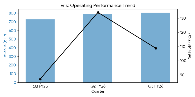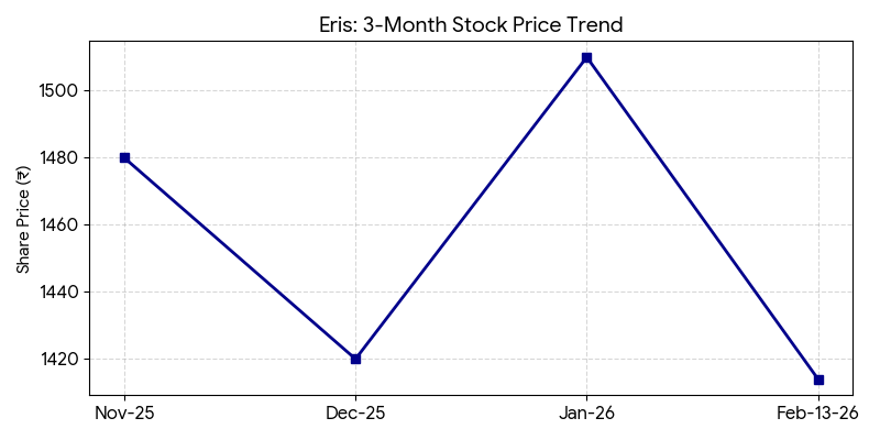 Eris shares closed at ₹1,414.65. Revenue grew 11% to a record ₹807.45 crores, while 9M profit rose 35%. Exceptional items impacted the quarterly bottom line.