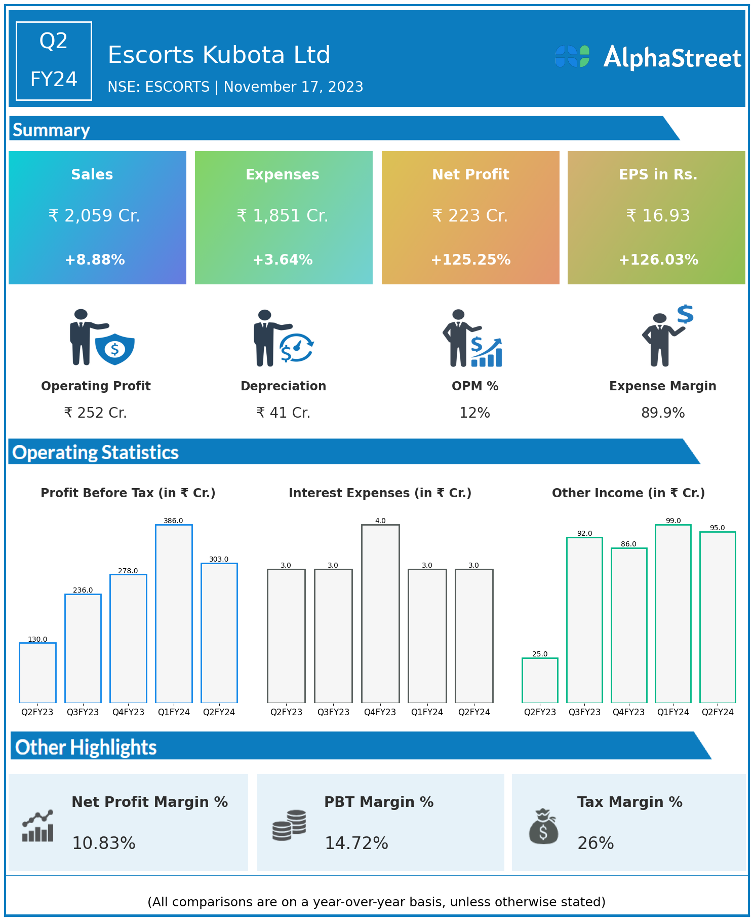 Escorts Kubota Ltd reported Revenues for Q2FY24 of ₹2,059.00 Crores up from ₹1,891.00 Crore year on year, a rise of 8.88%.