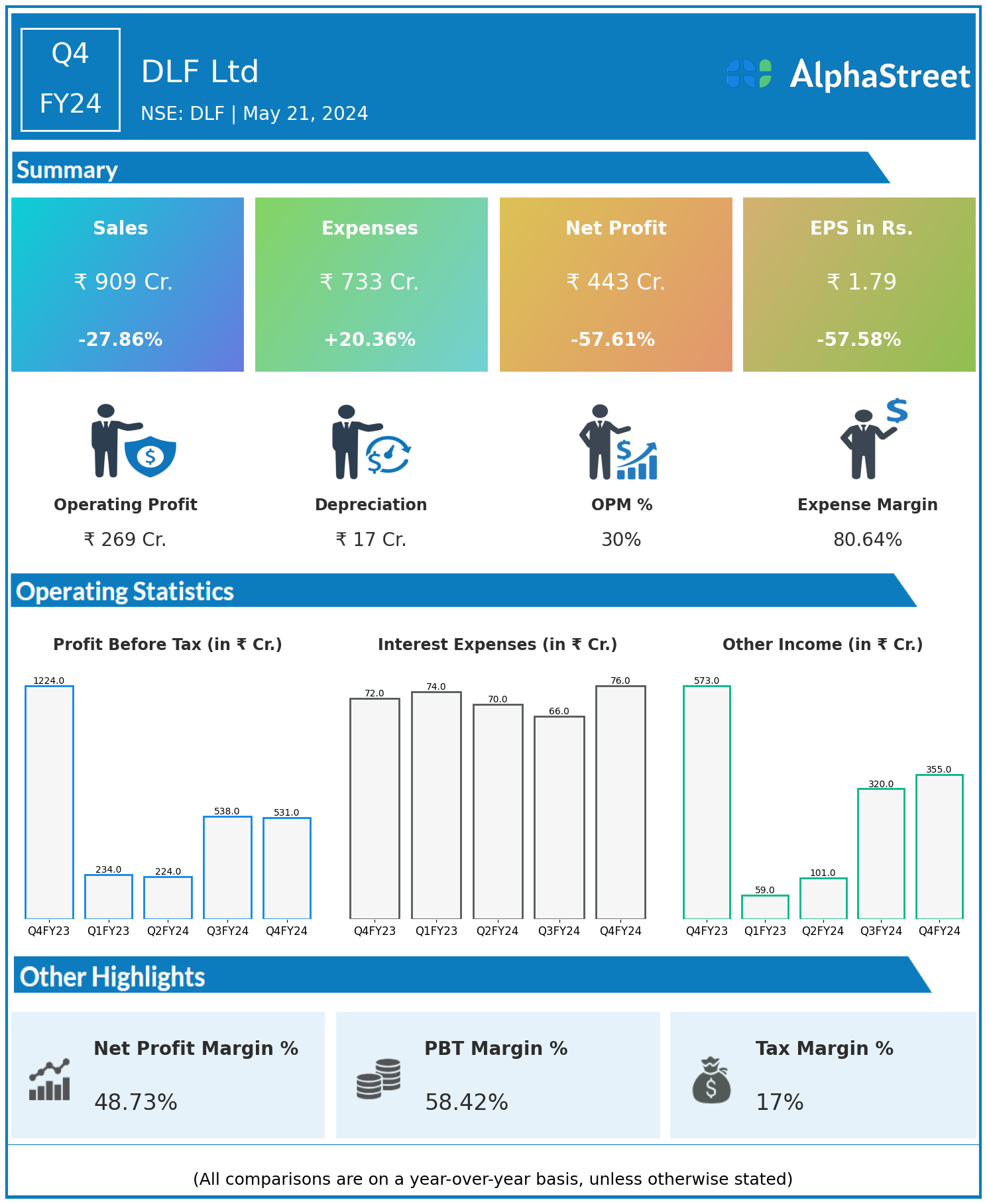 DLF Ltd reported Revenues for Q4FY24 of ₹909.00 Crores down from ₹1,260.00 Crore year on year, a fall of 27.86%.