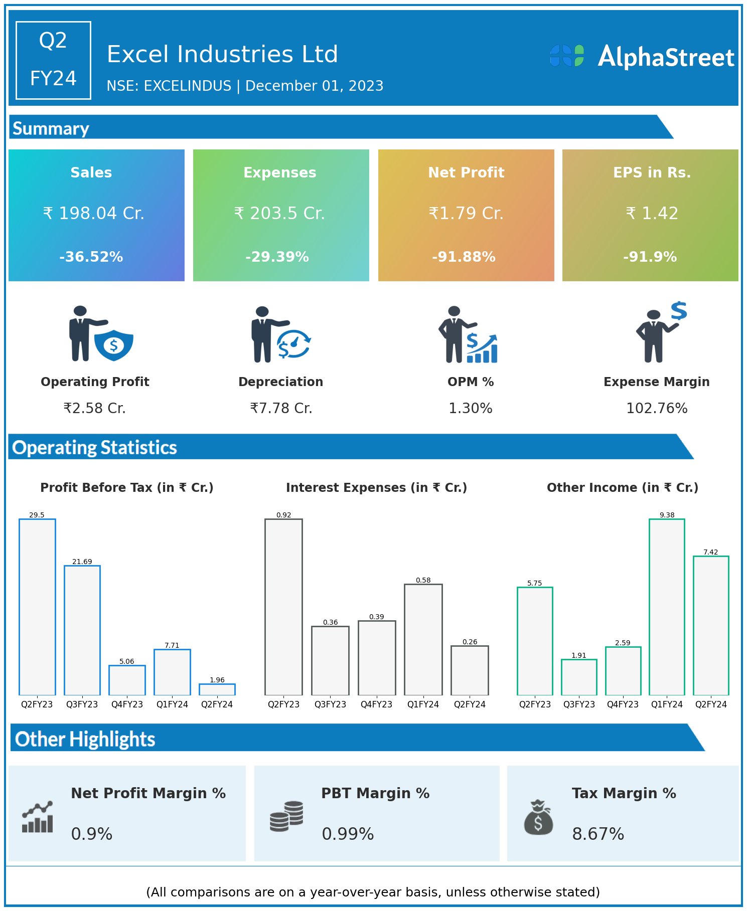 Excel Industries Ltd reported Revenues for Q2FY24 of ₹198.04 Crores down from ₹311.95 Crore year on year, a fall of 36.52%.