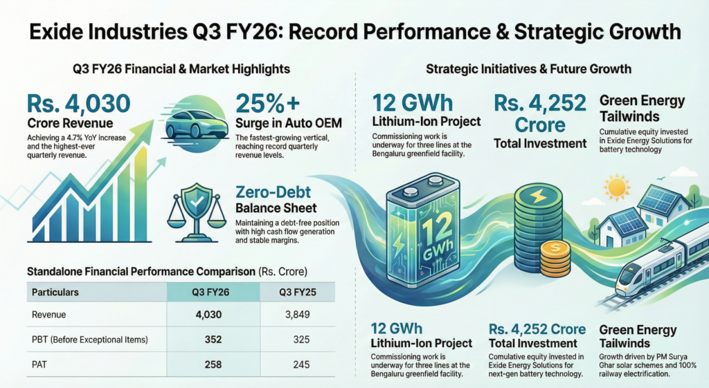 Exide Industries Limited reported standalone revenue of Rs. 4,030 crore for the quarter ended December 31, 2025, representing a 4.7% year-over-year increase. The growth was primarily driven by the automotive Original Equipment Manufacturer (OEM) and replacement markets. The company maintained an EBITDA margin of 11.7% despite rising raw material costs.