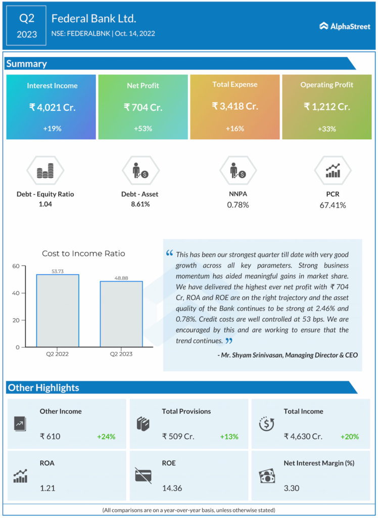 Federal Bank Ltd‘s Total Income for Q2 FY23 has increased by 20% YoY to ₹4,630 crores. Profits rose by 53% YoY to ₹ 704 crores. Total Expenditure grew by 16% YoY for Q2 FY 2023.