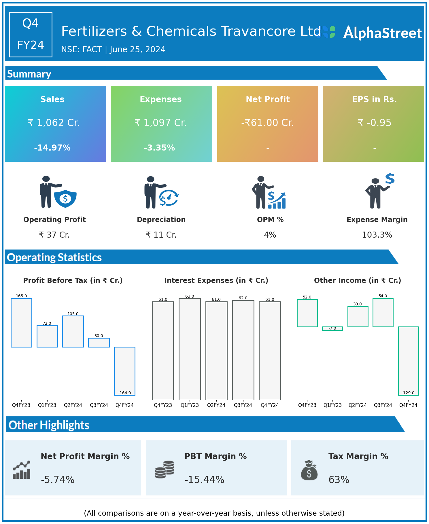 Total Expenses for Q4FY24 of ₹1,097.00 Crores down from ₹1,135.00 Crores year on year, a fall of 3.35%.