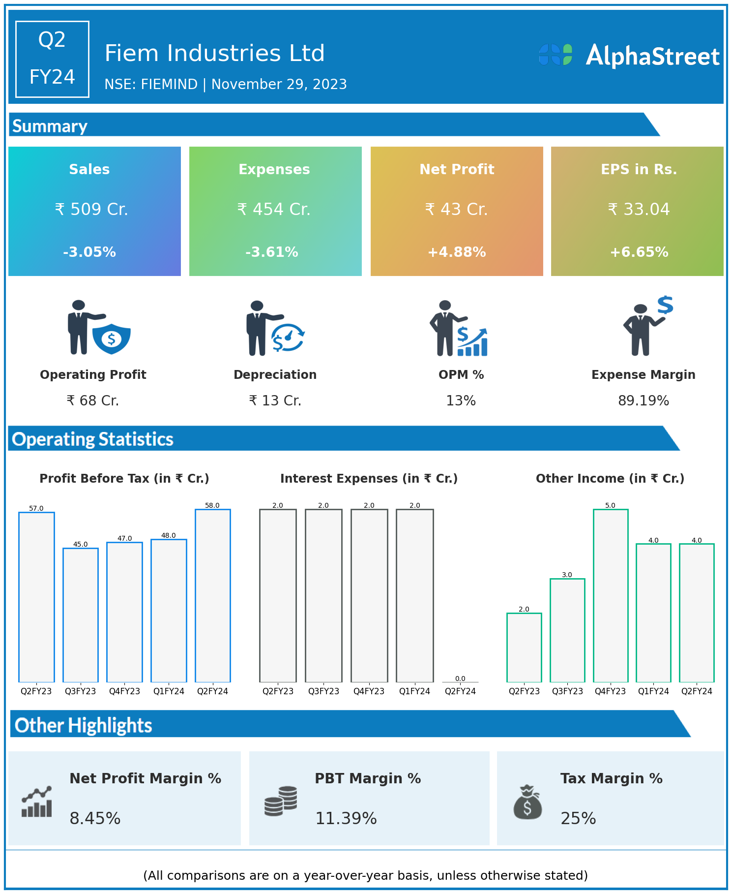 Fiem Industries Ltd reported Revenues for Q2FY24 of ₹509.00 Crores down from ₹525.00 Crore year on year, a fall of 3.05%.