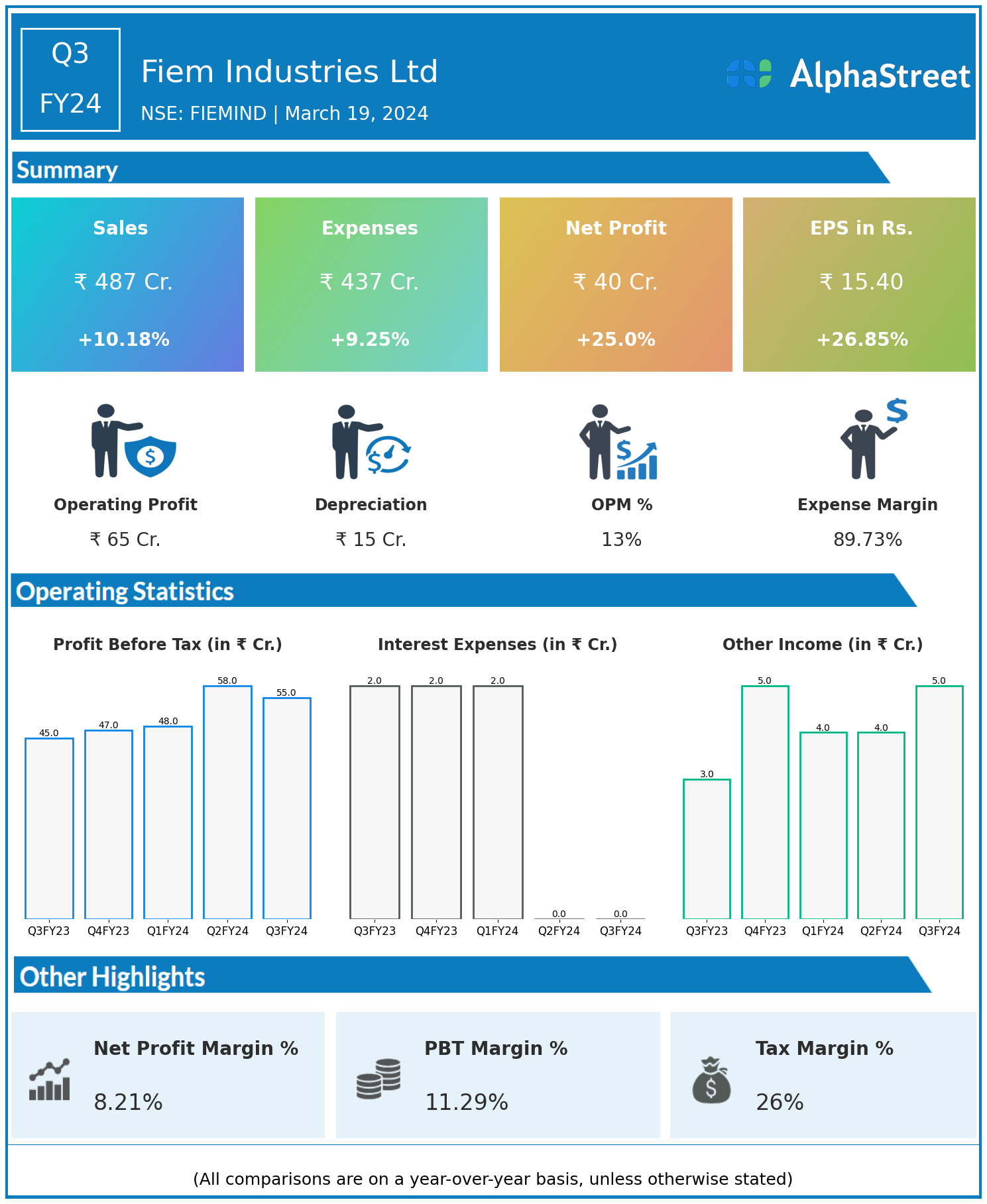Fiem Industries Ltd reported Revenues for Q3FY24 of ₹487.00 Crores up from ₹442.00 Crore year on year, a rise of 10.18%.