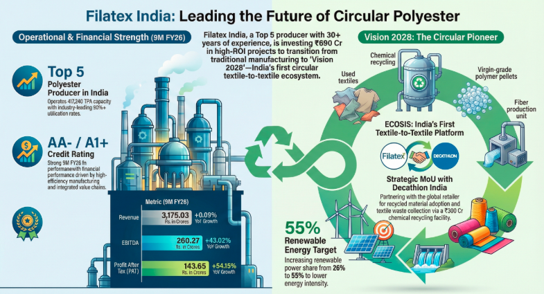 Filatex India delivered stable revenue in Q3 FY26 and higher profitability on improved product mix and operating efficiency. Nine-month earnings showed strong margin-led growth. The company is investing in capacity expansion, circular recycling and renewable energy to support medium-term growth and align its operations with sustainability trends.