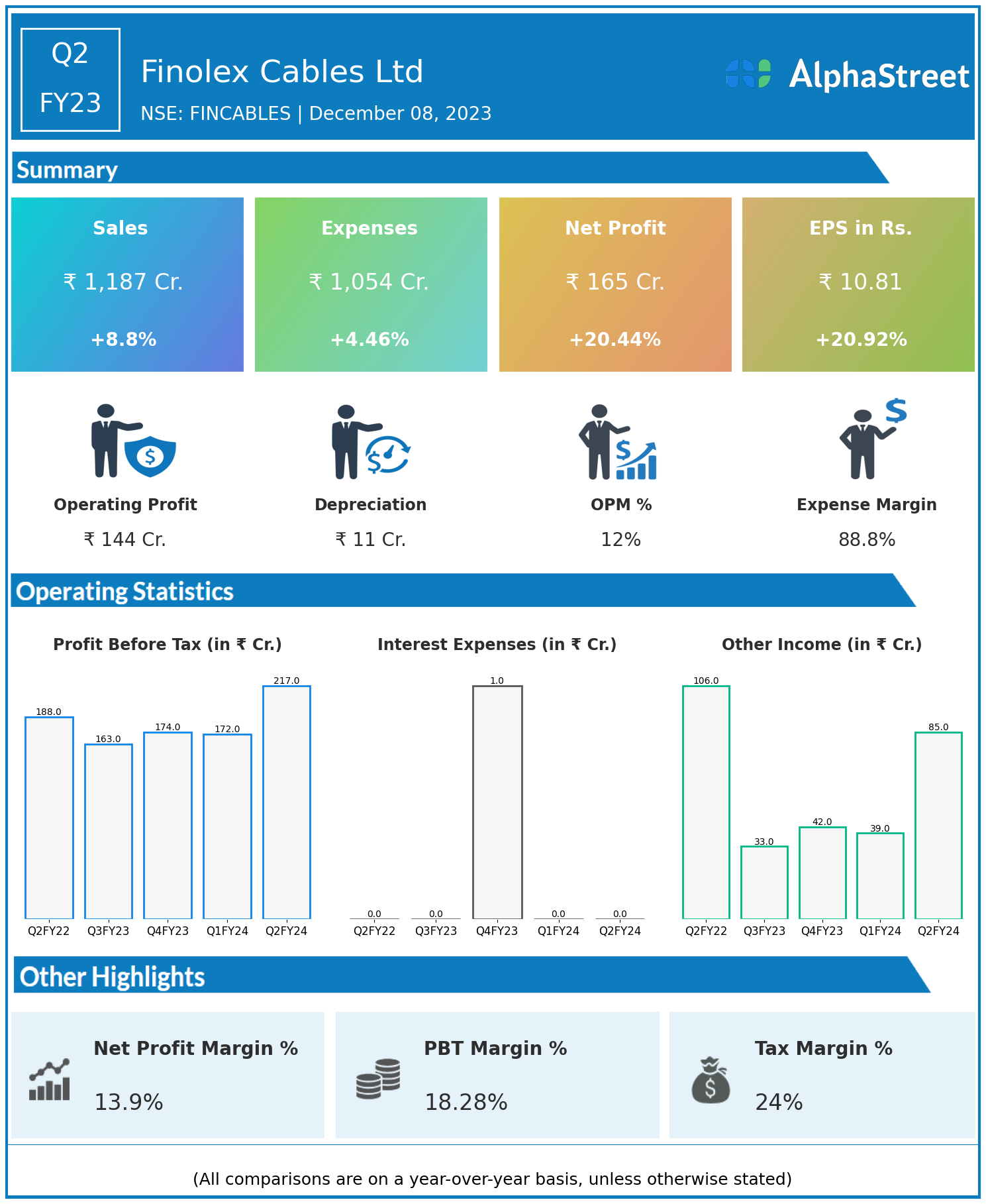 Finolex Cables Ltd reported Revenues for Q2FY24 of ₹1,187.00 Crores up from ₹1,091.00 Crore year on year, a rise of 8.8%.