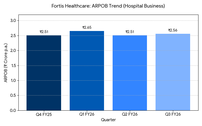 Fortis Healthcare expanded its operational footprint through the acquisition of the 125-bedded People Tree Hospital in Bengaluru for ₹430 crore in January 2026. This facility, located in Yeshwanthpur, includes adjacent land providing potential to scale to 300 beds. Additionally, the company launched ‘Adayu’, a 36-bedded specialized mental health facility in Gurugram, in November 2025. Hospital occupancy remained stable at 67%, while the Average Revenue Per Occupied Bed (ARPOB) increased 4.5% to ₹2.56 crore per annum.
