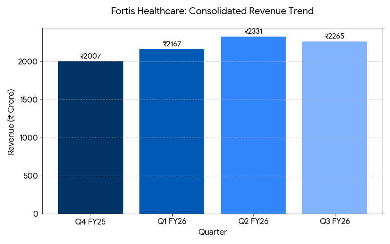 For the quarter ended December 31, 2025 (Q3 FY2026), Fortis Healthcare reported consolidated revenue from operations of ₹2,265 crore, a 17.5% increase compared to ₹1,928 crore in the corresponding quarter of the previous fiscal year. Consolidated net profit for the period was ₹197 crore, down 22% from ₹254 crore in Q3 FY2025. This bottom-line contraction was primarily attributed to an exceptional loss of ₹55.2 crore related to the implementation of new labor codes, partially offset by a ₹9.4 crore impairment reversal.