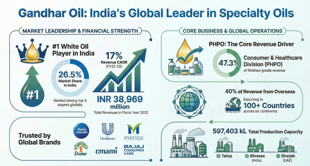 Gandhar serves a “who’s who” of Indian and global giants, including Unilever, P&G, Marico, Dabur, and Patanjali. These long-term relationships are reinforced by the company’s ability to provide customized solutions, such as specialized hair serums and automotive oils for sub-zero temperatures. The high cost associated with switching suppliers further solidifies Gandhar’s position with its core clients.