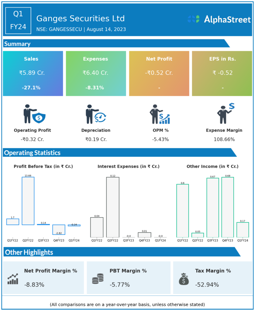 - Ganges Securities Ltd reported Revenues for Q1FY24 of ₹5.89 Crores down from ₹8.08 Crore year on year, a fall of 27.1%.