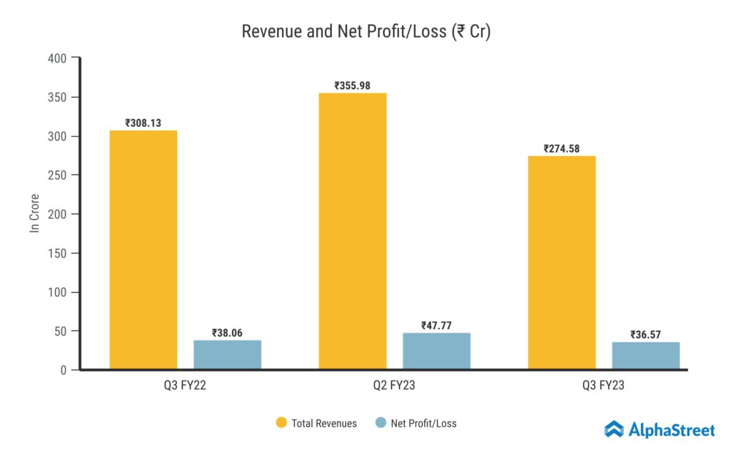 Garware Technical Fibres Limited reported Revenue from Operations for Q3 FY23 of ₹274.58 Crore up from ₹308.13 Crore year on year, a decline of 11%. This was due to the company’s Synthetic Cordage segment which dropped by 13% down to ₹239.97 Crore. Consolidated Net Profit of ₹46.59 Crore, down 8.4% from ₹50.89 Crore in the same quarter of the previous year. The Earnings per Share is ₹17.74 for this quarter.