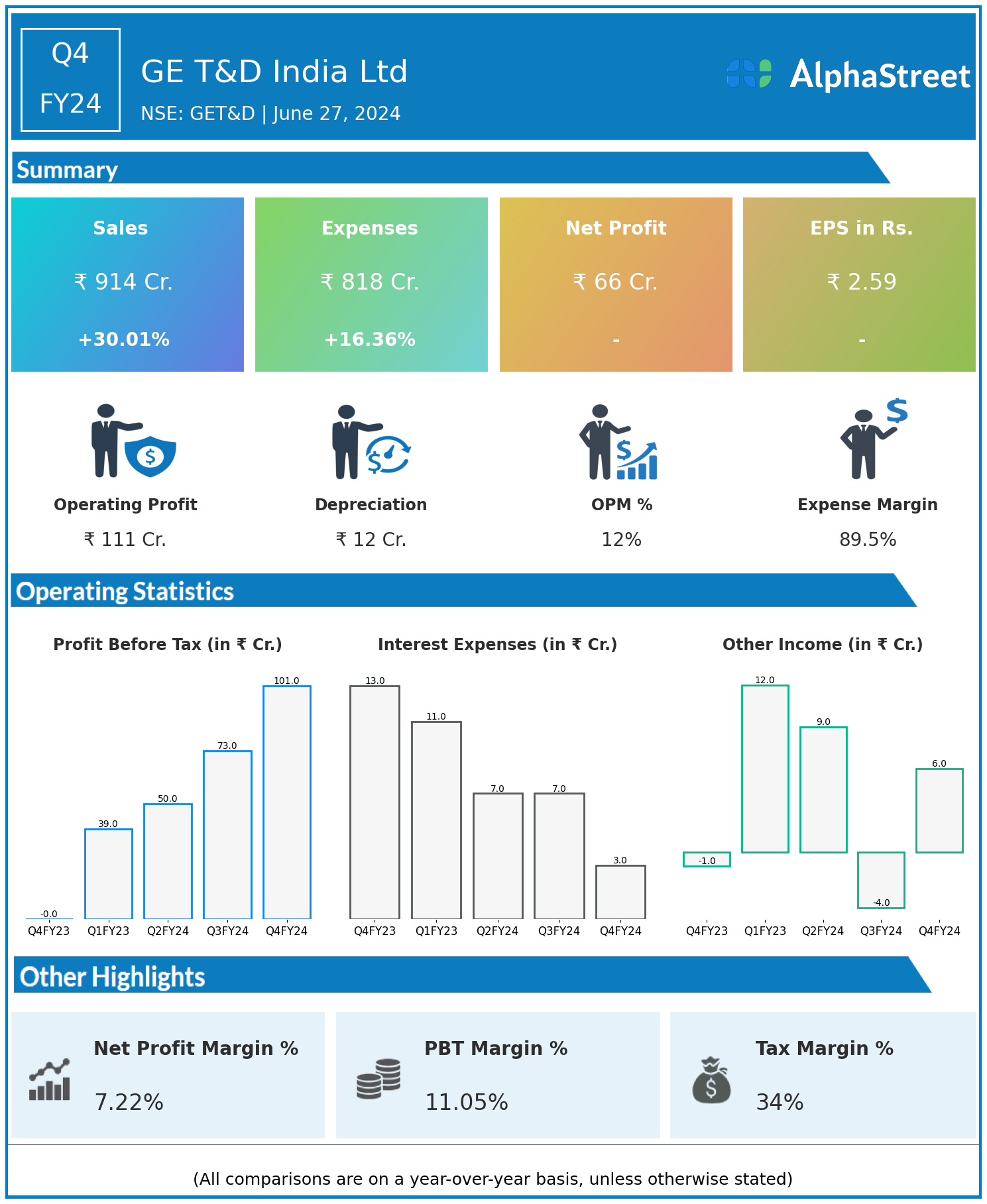 GE T&D India Ltd reported Revenues for Q4FY24 of ₹914.00 Crores up from ₹703.00 Crore year on year, a rise of 30.01%.