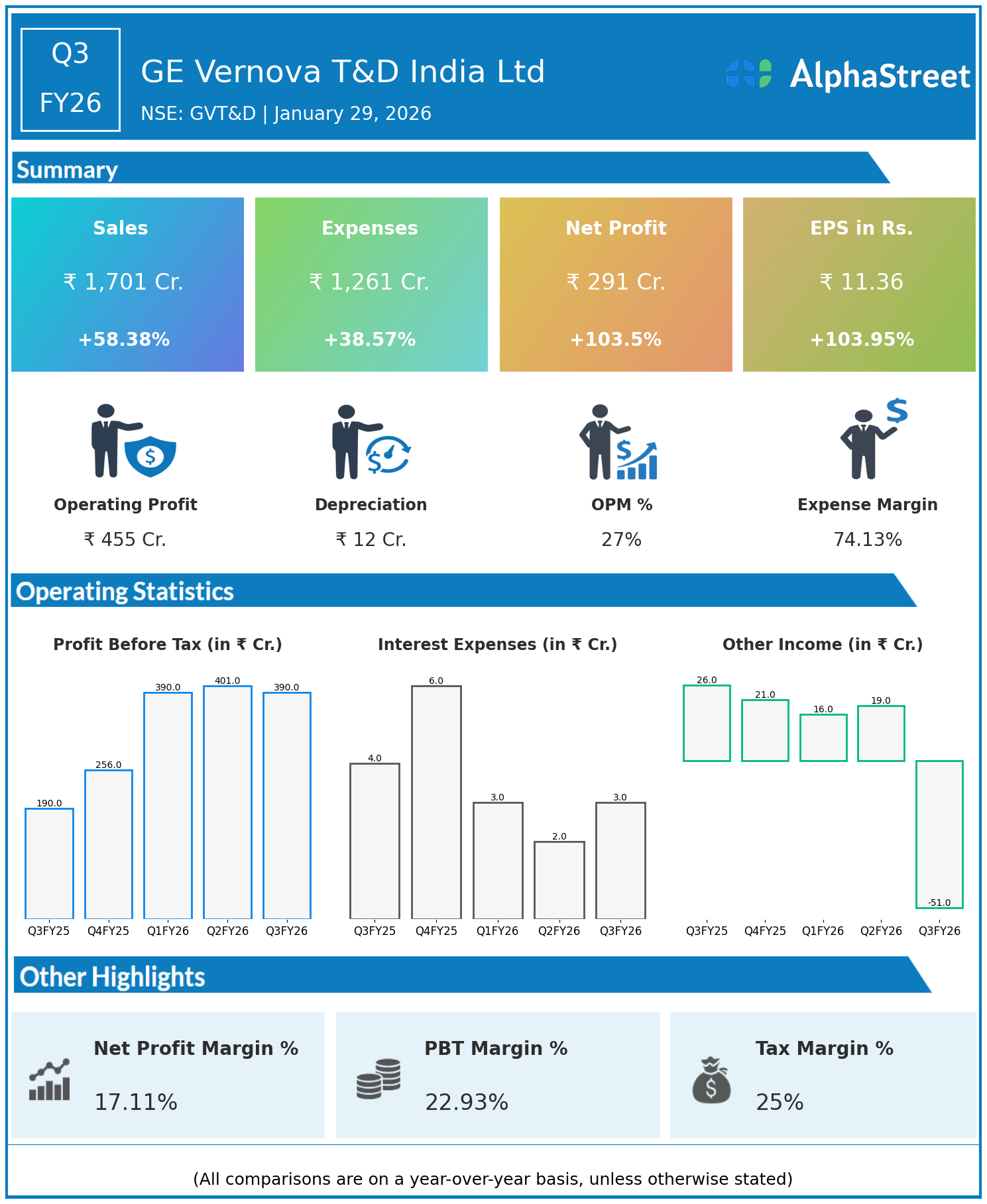GE Vernova T&D India Ltd reported Q3FY26 revenues of ₹1,701 crore, up 58.38% YoY, with consolidated net profit surging 103.5% to ₹291 crore. Total expenses rose 38.57% YoY to ₹1,261 crore, reflecting exceptional operating leverage in transmission equipment.