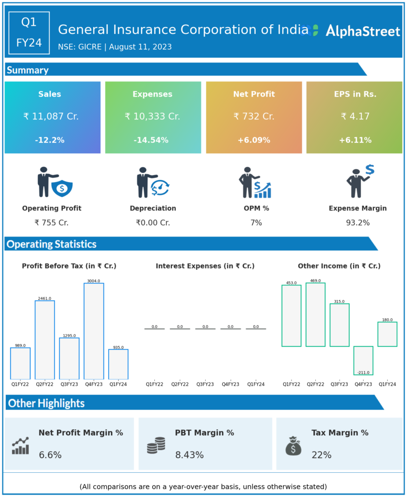 - General Insurance Corporation of India reported Revenues for Q1FY24 of ₹11,087.00 Crores down from ₹12,627.00 Crore year on year, a fall of 12.2%.