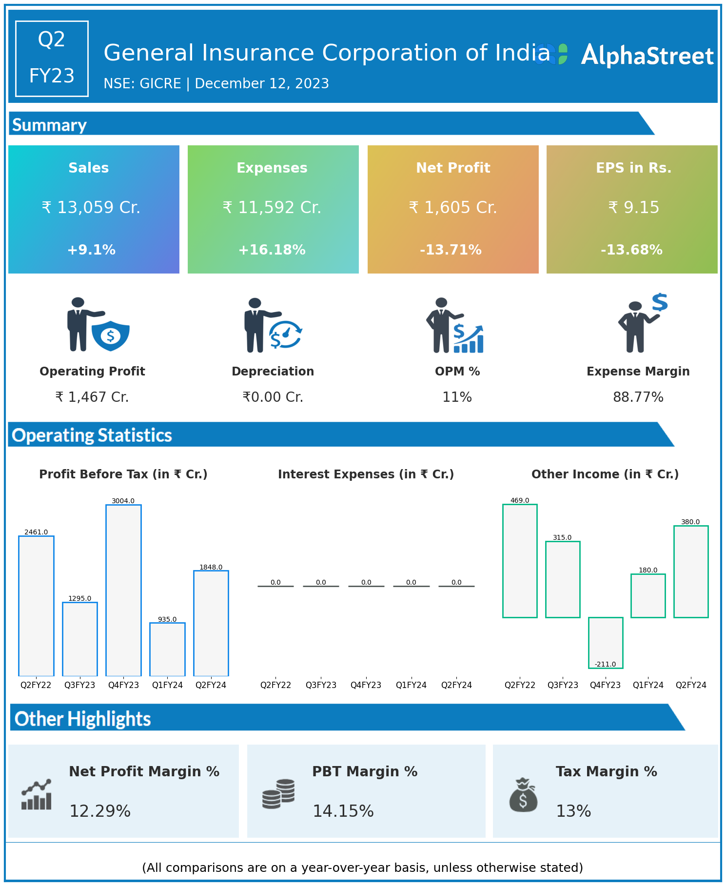 General Insurance Corporation of India reported Revenues for Q2FY24 of ₹13,059.00 Crores up from ₹11,970.00 Crore year on year, a rise of 9.1%.