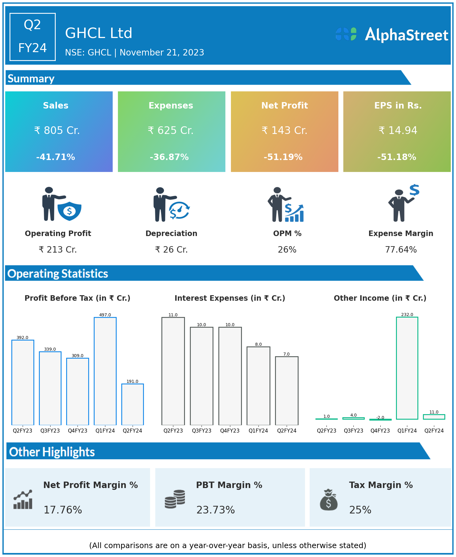 GHCL Ltd reported Revenues for Q2FY24 of ₹805.00 Crores down from ₹1,381.00 Crore year on year, a fall of 41.71%.