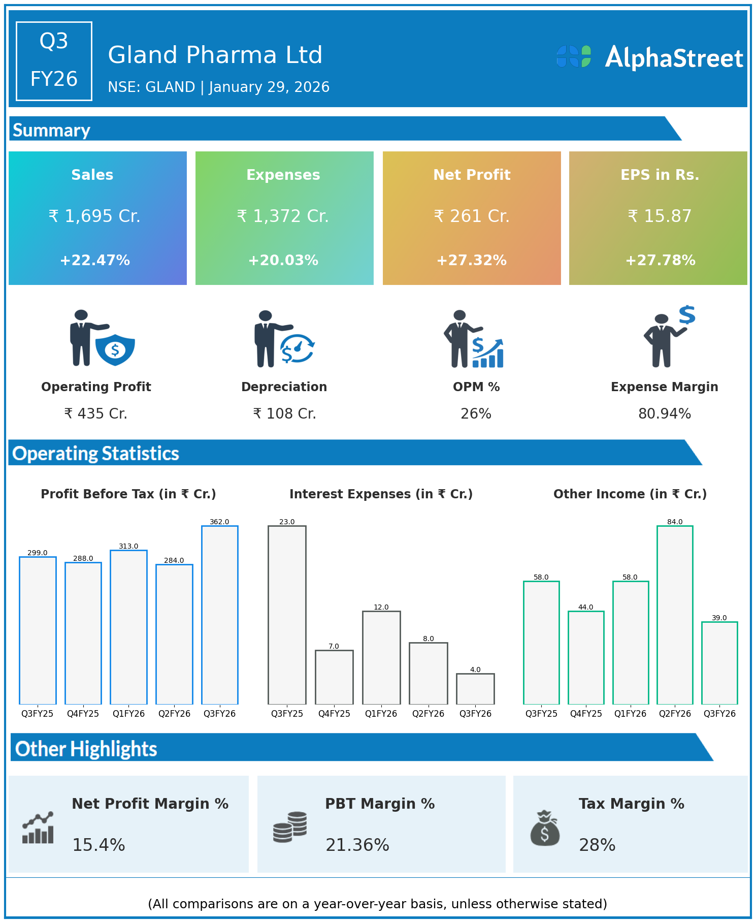 Gland Pharma Ltd reported Q3FY26 revenues of ₹1,695 crore, up 22.47% YoY, with consolidated net profit rising 27.32% to ₹261 crore. Total expenses increased 20.03% YoY to ₹1,372 crore, reflecting strong revenue growth with controlled cost escalation.