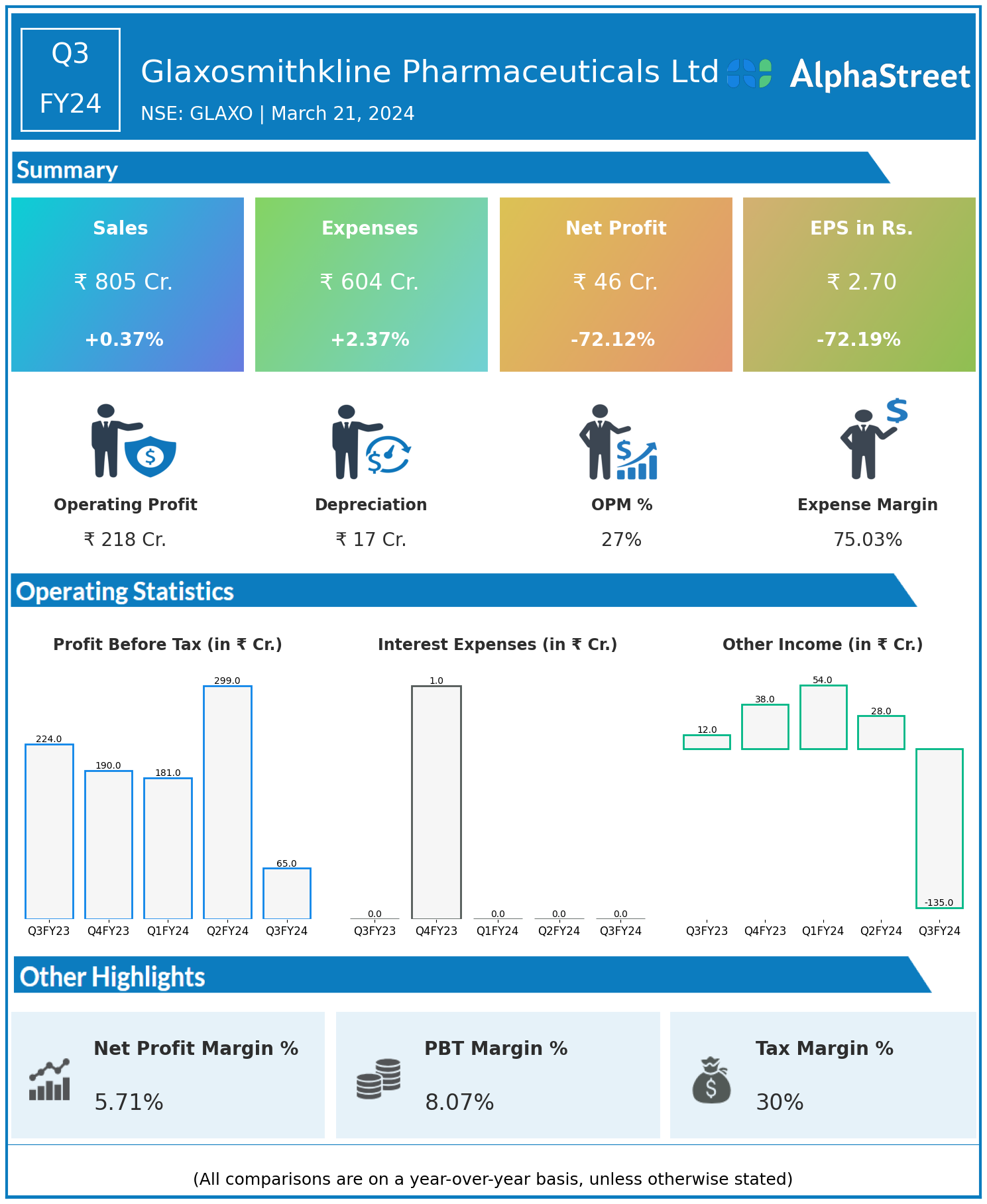Glaxosmithkline Pharmaceuticals Ltd reported Revenues for Q3FY24 of ₹805.00 Crores up from ₹802.00 Crore year on year, a rise of 0.37%.