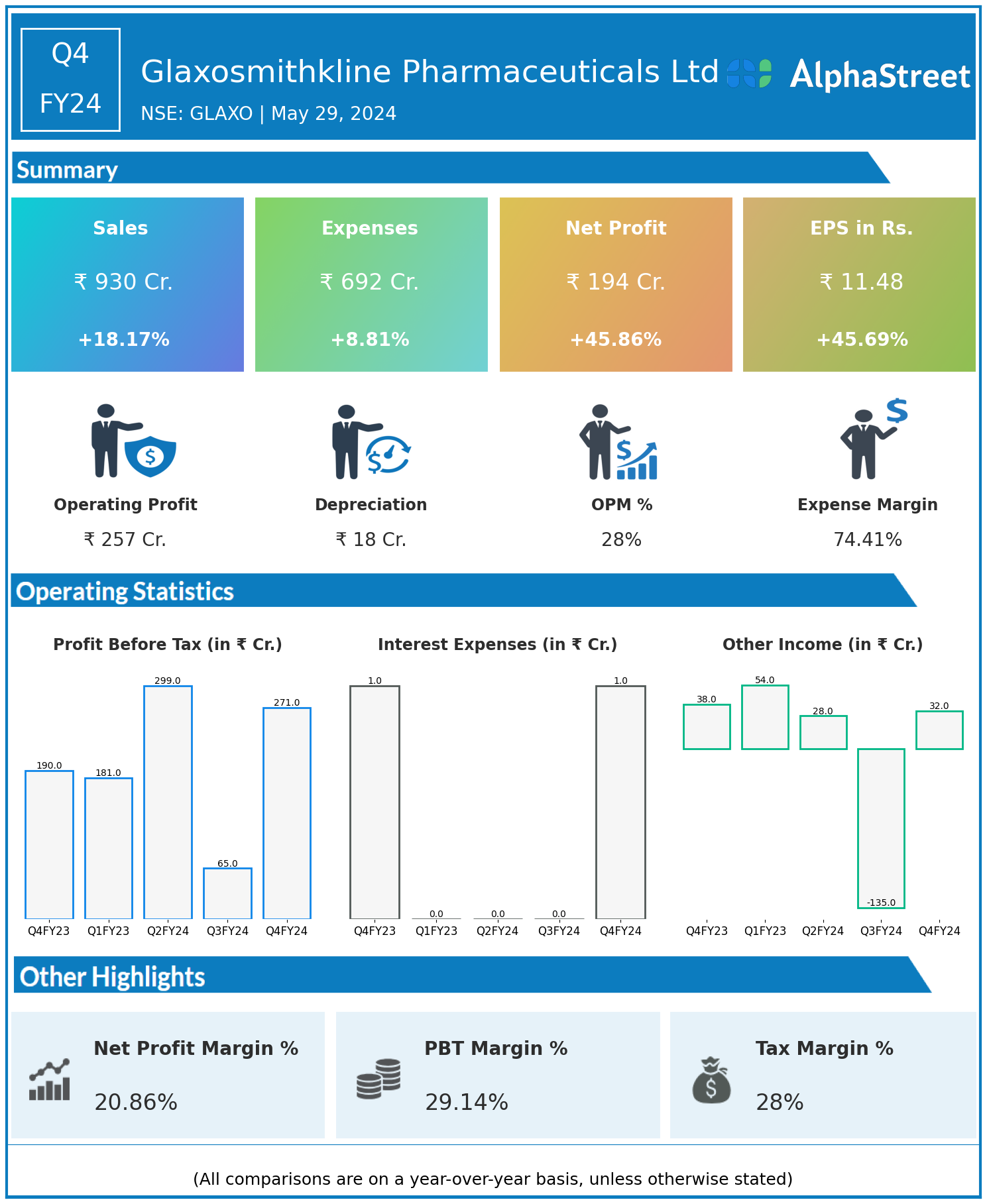 Glaxosmithkline Pharmaceuticals Ltd reported Revenues for Q4FY24 of ₹930.00 Crores up from ₹787.00 Crore year on year, a rise of 18.17%.