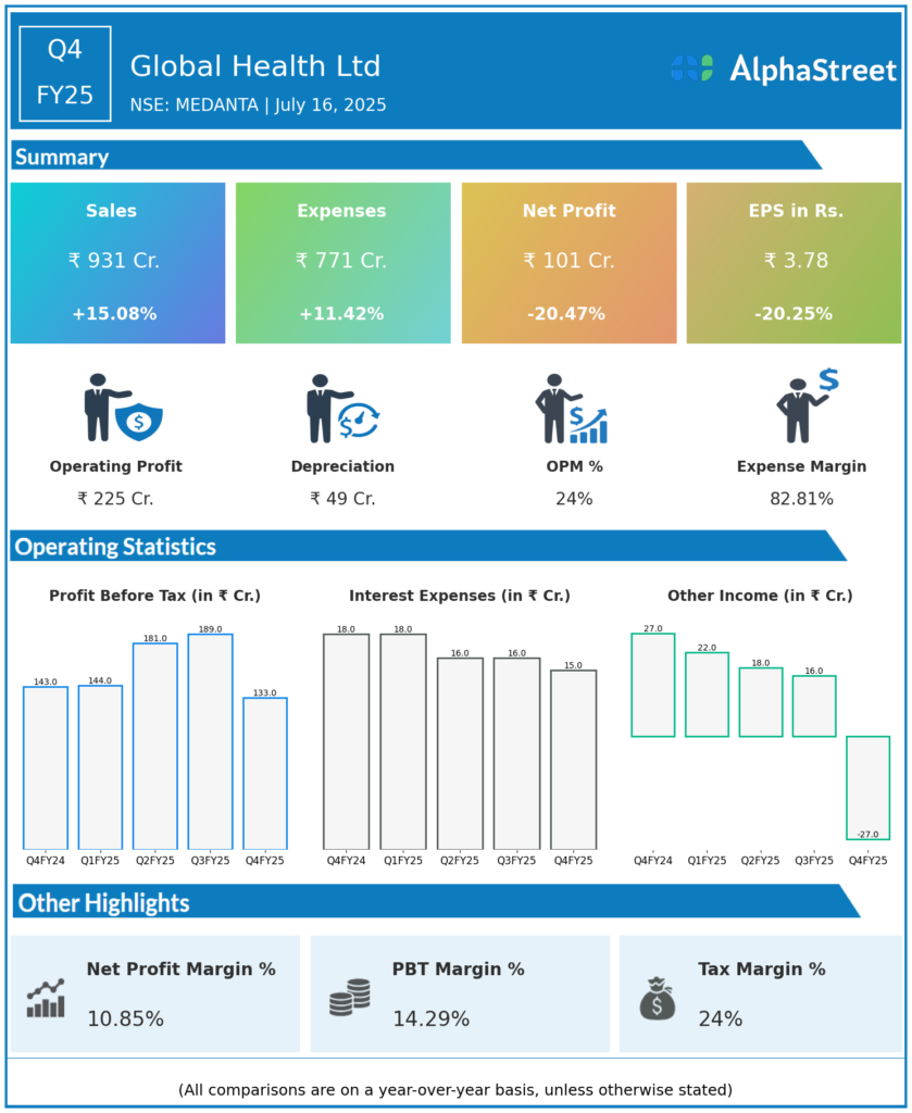 Global Health Ltd reported Revenues for Q4FY25 of ₹931.00 Crores up from ₹809.00 Crore year on year, a rise of 15.08%.