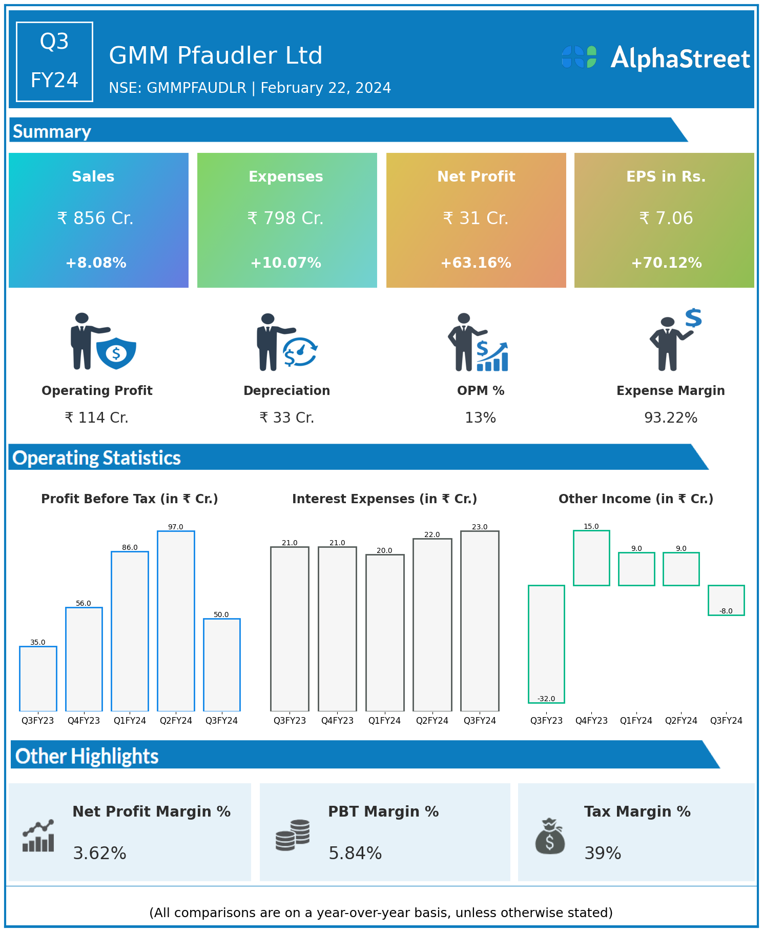 GMM Pfaudler Ltd reported Revenues for Q3FY24 of ₹856.00 Crores up from ₹792.00 Crore year on year, a rise of 8.08%.