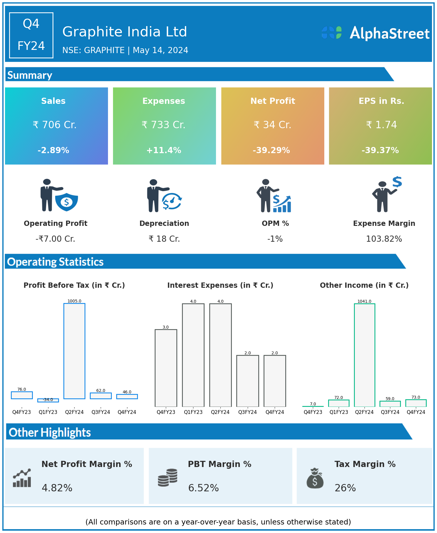 Graphite India Ltd reported Revenues for Q4FY24 of ₹706.00 Crores down from ₹727.00 Crore year on year, a fall of 2.89%.