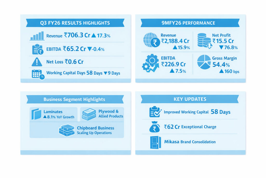 The core laminate business grew 8.1% in value terms during Q3, while the plywood and allied products segment, which includes engineered floors and doors, recorded a 9.5% YoY growth. The chipboard business, which began commercial production in early 2025, showed sequential growth of 11.4%.