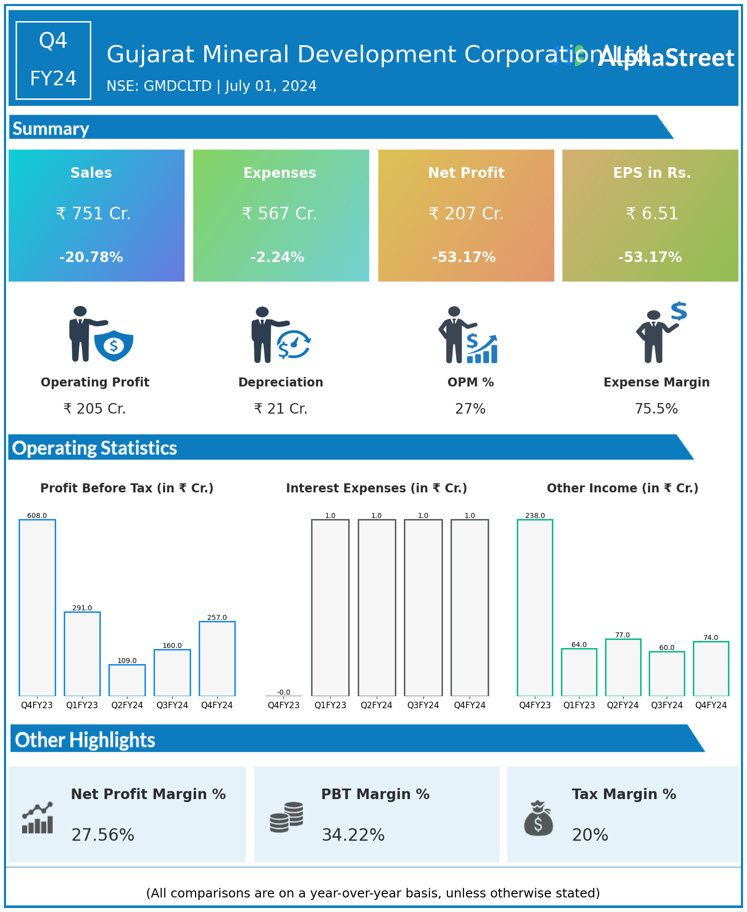 Gujarat Mineral Development Corporation Ltd reported Revenues for Q4FY24 of ₹751.00 Crores down from ₹948.00 Crore year on year, a fall of 20.78%.