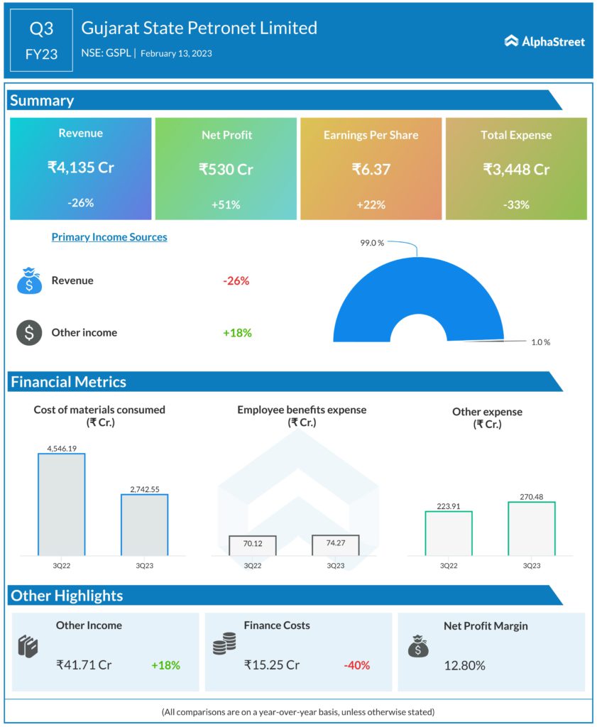 Gujarat State Petronet Limited (NSE: GSPL) reported a Revenue from Operations of ₹4,135.03 Crores, a decline of 26% from the previous year. The Consolidated Net Profit for the business increased by 51% year over year, to ₹529.63 Crore from ₹350.95 Crore.