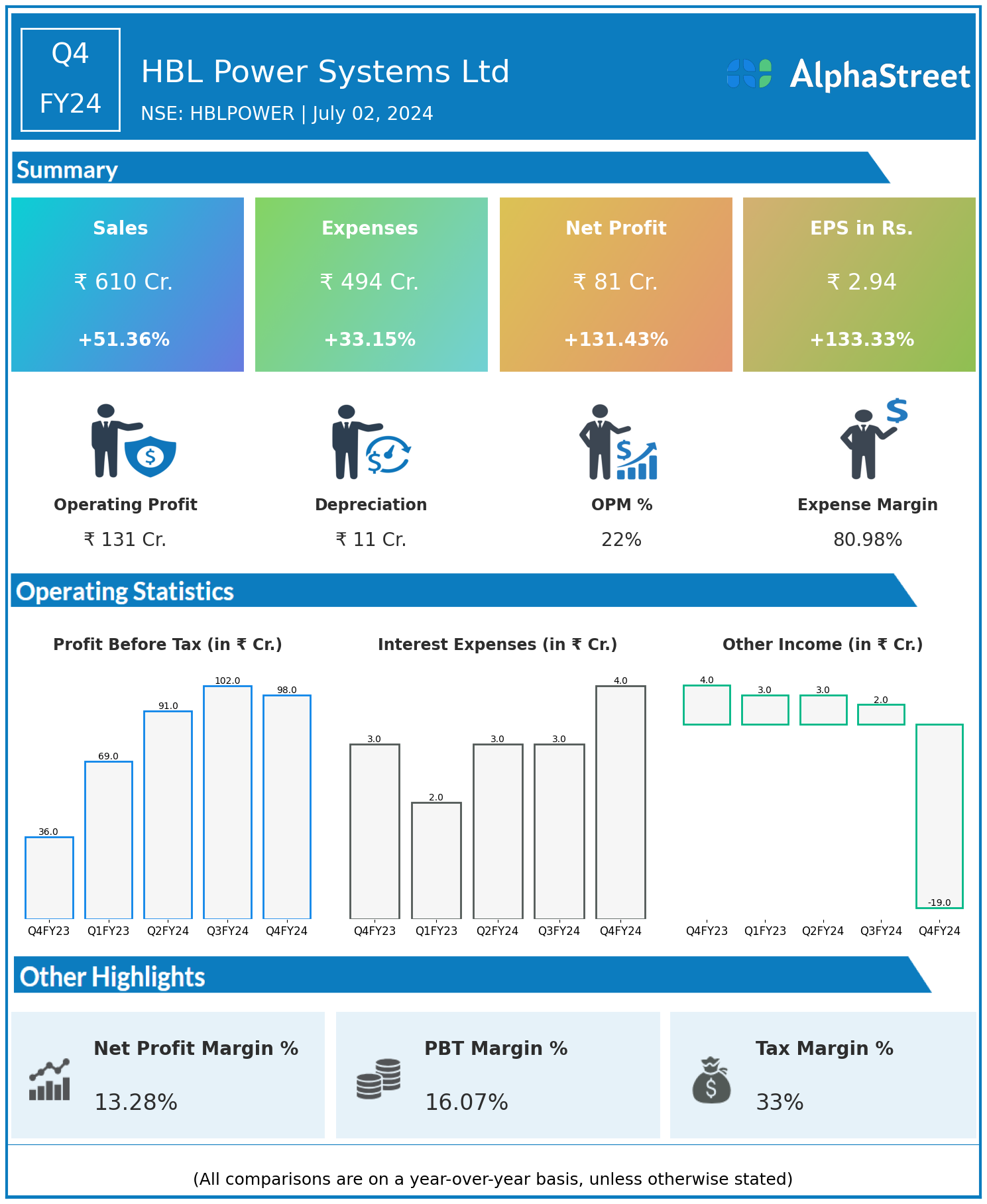 HBL Power Systems Ltd reported Revenues for Q4FY24 of ₹610.00 Crores up from ₹403.00 Crore year on year, a rise of 51.36%.