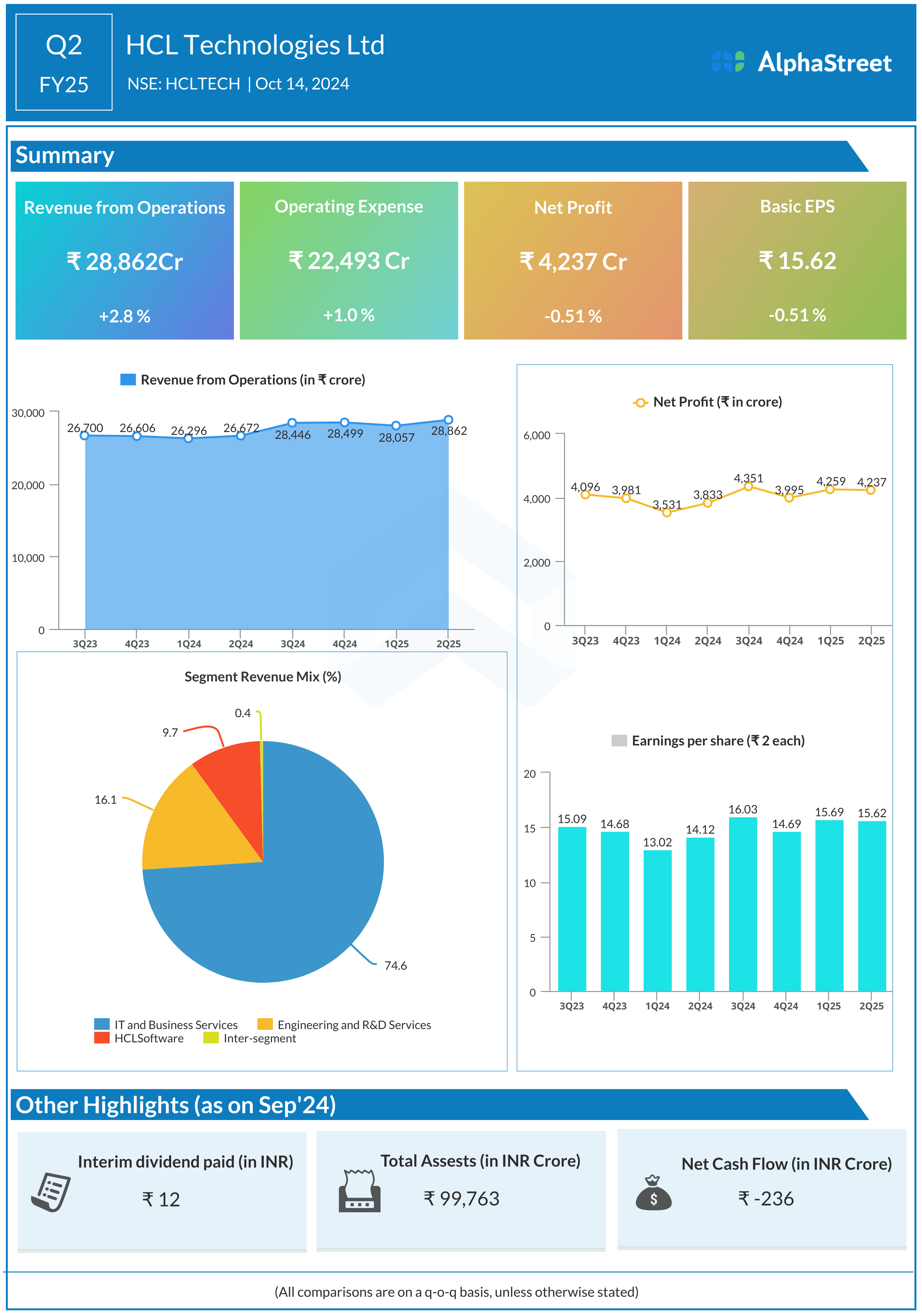 HCL Technologies Ltd reported Revenues for Q2FY25 of ₹28,862 Crores up from ₹26,672 Crore year on year, a rise of 8.21%.