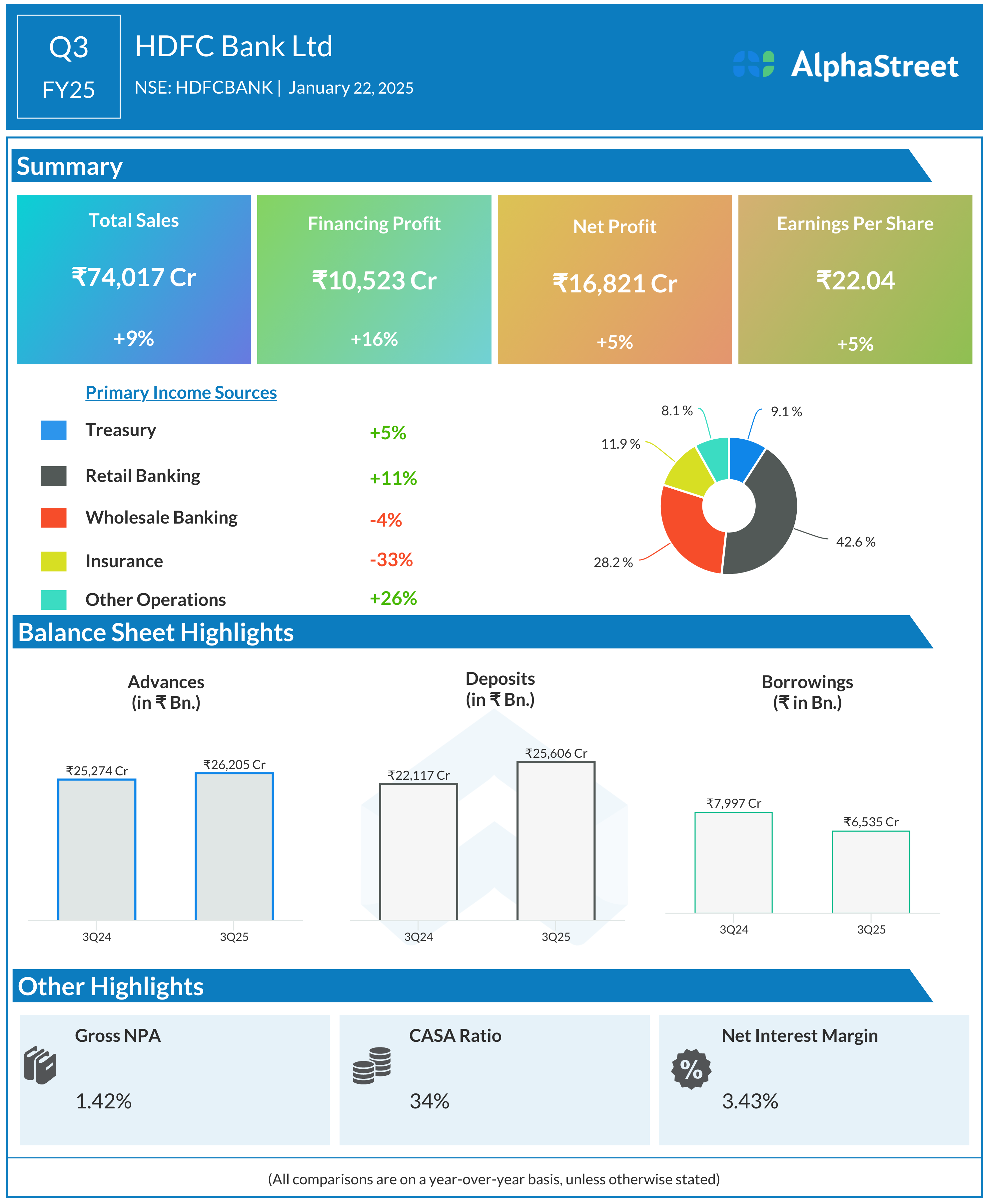 HDFC Bank Ltd reported Revenues for Q3FY25 of ₹85,040.00 Crores up from ₹78,008.00 Crore year on year, a rise of 9.01%.