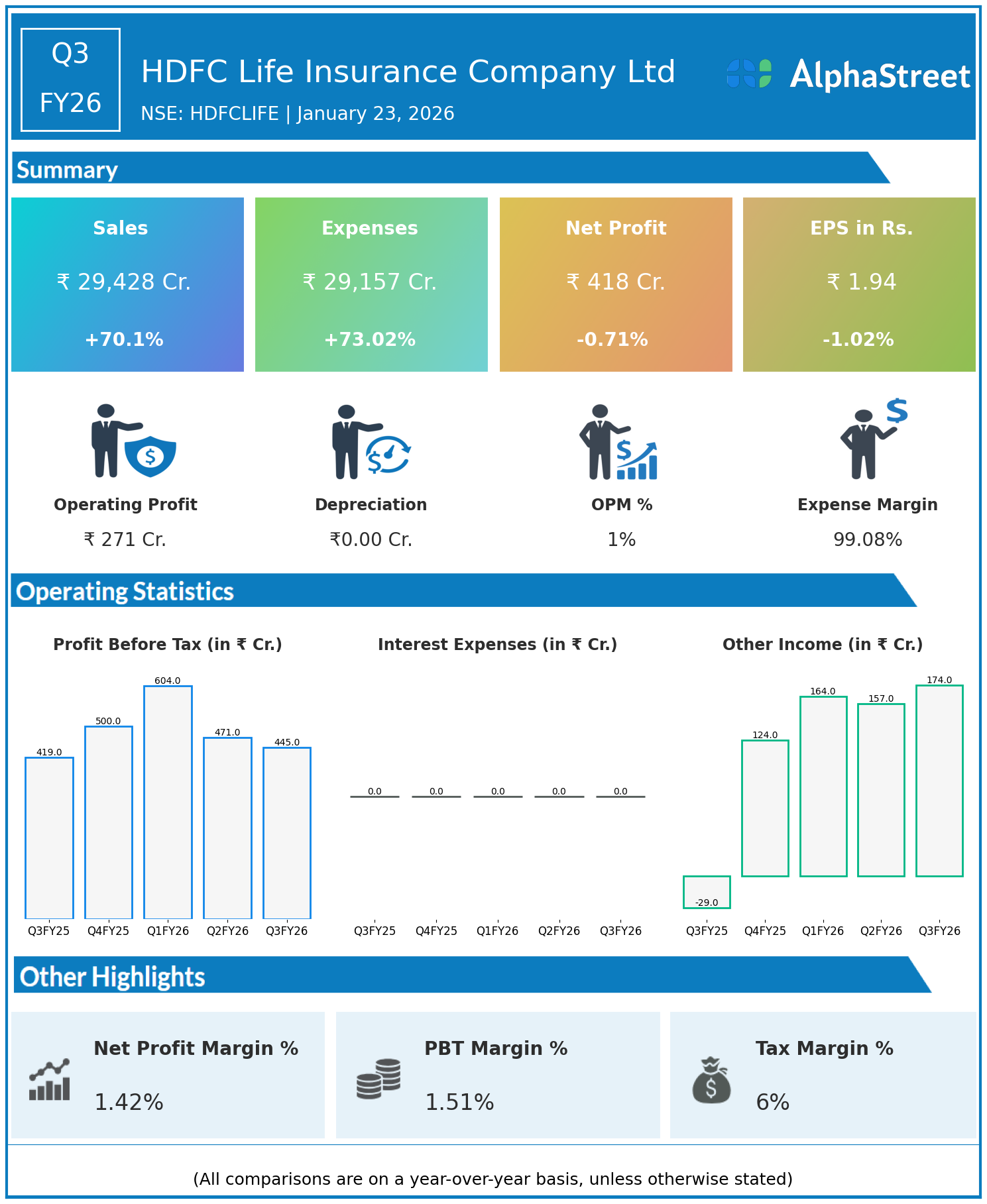 HDFC Life Insurance Company Ltd reported Revenues for Q3FY26 of ₹29,428.00 Crores up from ₹17,300.00 Crore year on year, a rise of 70.1%.