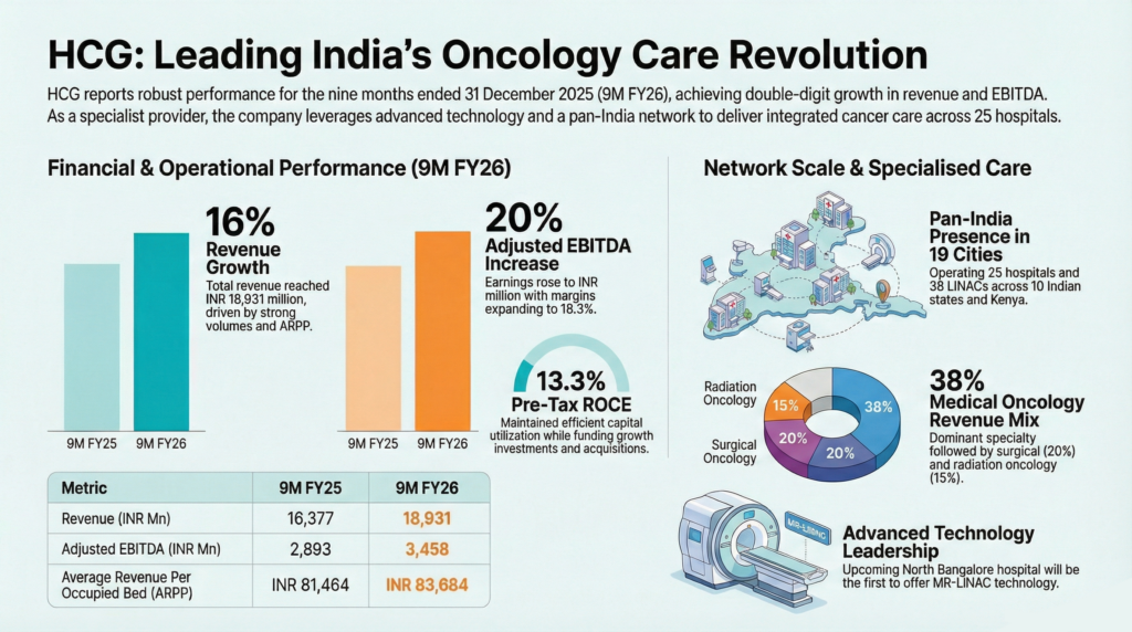 HealthCare Global Enterprises Limited (NSE: HCG; BSE: 539787) India’s largest specialized cancer care provider, reported 13% revenue growth and 20% adjusted EBITDA expansion for the third quarter ended December 31, 2025. On the reporting day, the stock price reached ₹564.20, a 0.78% decrease, implying a capitalization of ₹7,955.65 crore.
