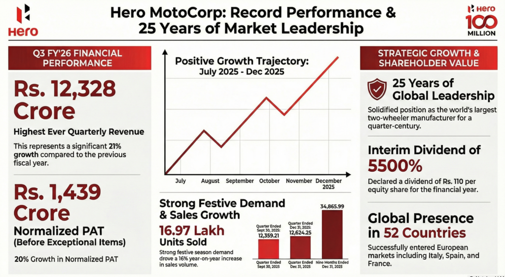 Hero MotoCorp Ltd (HEROMOTOCO) reported its highest-ever quarterly revenue of Rs 12,328 crore for the third quarter ended December 31, 2025. This represents a 21% year-on-year increase, underpinned by sales volumes of 16.97 lakh units, a 16% rise over the same period last year. Normalized profit after tax (PAT) reached Rs 1,439 crore, reflecting a 20% growth compared to the previous fiscal.
