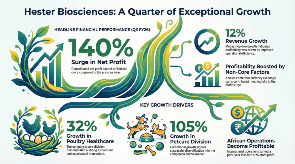 Hester Biosciences announced a consolidated net profit of ₹106.69 crore for the quarter ended December 2025, representing a 140% increase year-over-year. Standalone revenue for the period reached ₹84 crore, while consolidated revenue rose 12% to approximately ₹90.40 crore. The Poultry Healthcare Division recorded a 32% increase in sales, while vaccine sales specifically grew by 20%. The Petcare Division achieved growth of 105% during the quarter. These results indicate a profit turnaround driven by operational efficiency and margin expansion despite relatively modest topline growth. This indicates a significant profit turnaround.