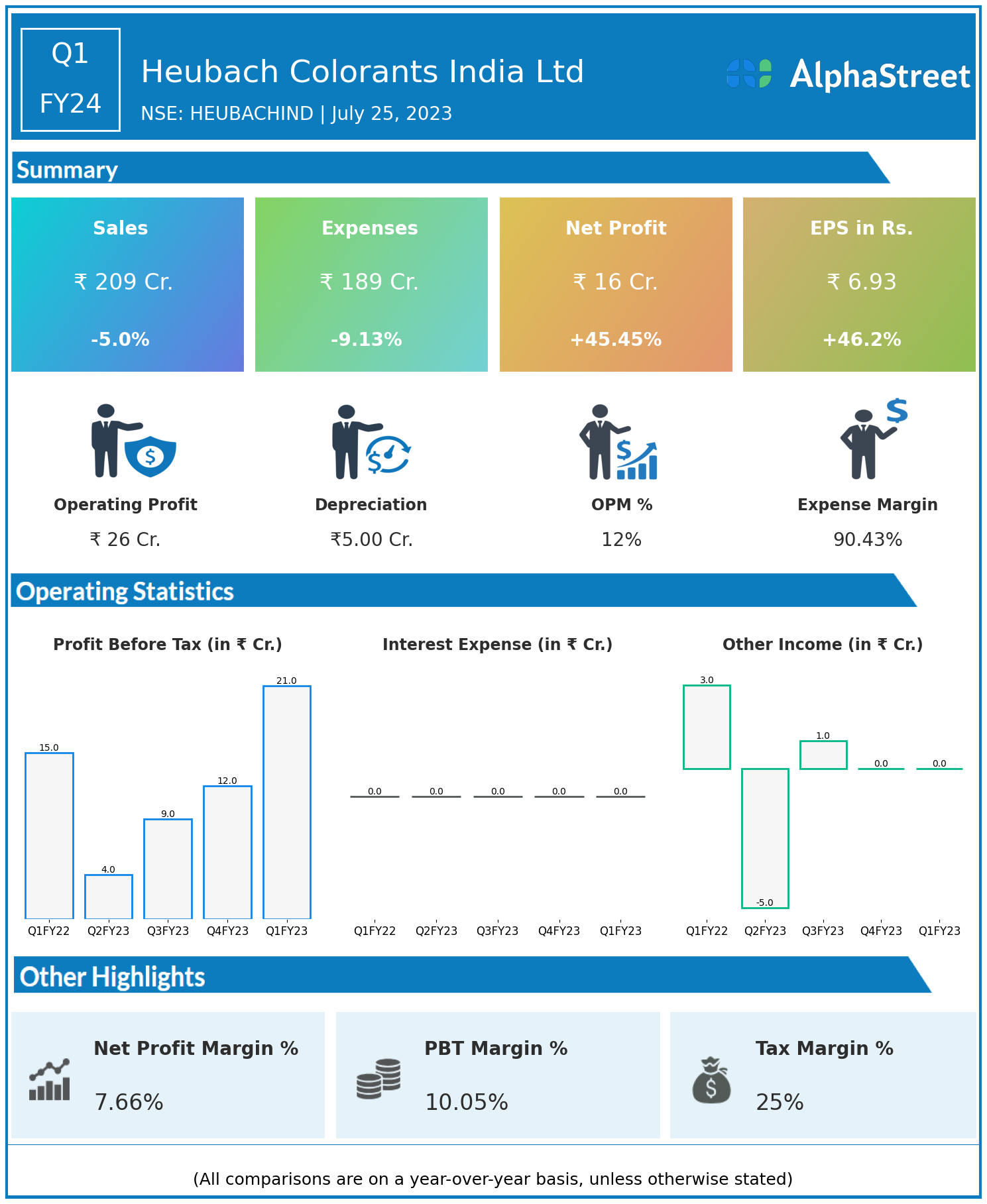 - Heubach Colorants India Ltd reported Revenues for Q1FY24 of ₹209.00 Crores down from ₹220.00 Crore year on year, a fall of 5.0%.